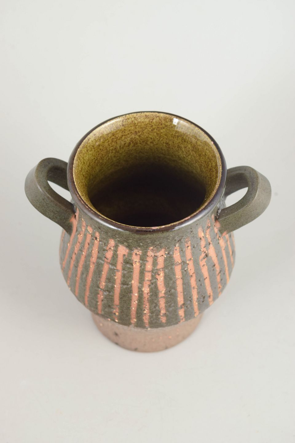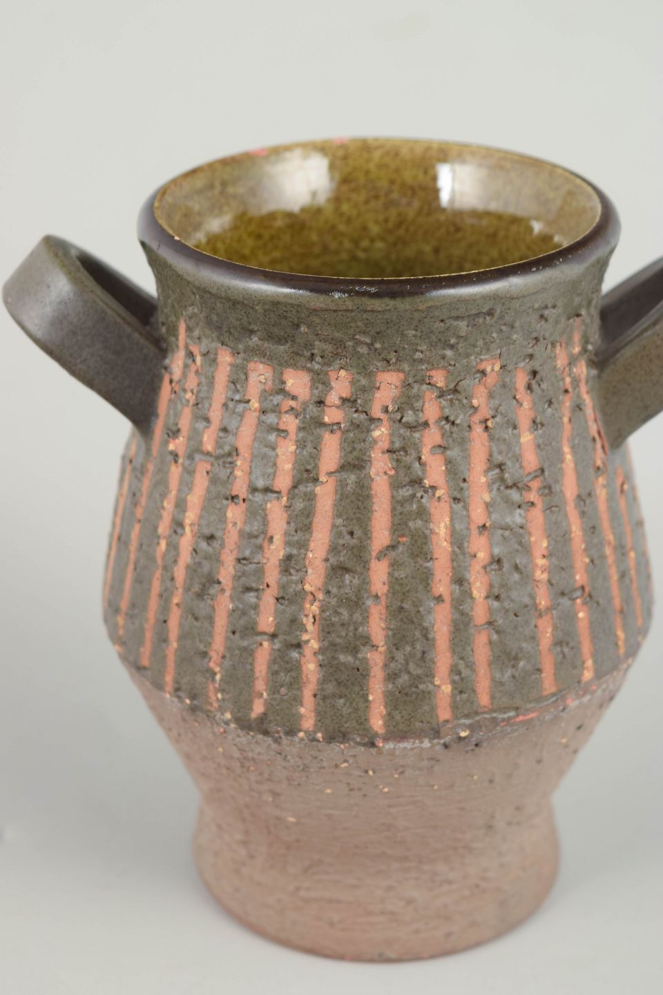 Keramisk vase med let balusterform og to små hanke. Udført i stentøj med struktureret overflade, lodrette reliefstriber og glasur i dæmpede jordfarver med kontrast mellem krop og munding. Et karakteristisk eksempel på Mari Simmulsons formsprog fra 1960’erne.