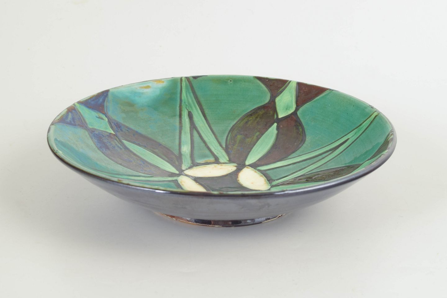 Håndglaseret skål i keramik med geometrisk dekoration i grønne og brune nuancer. Klassisk Art Deco-udtryk med tydelig værkstedsmæssig karakter, udført med levende glasur og håndmalede detaljer.