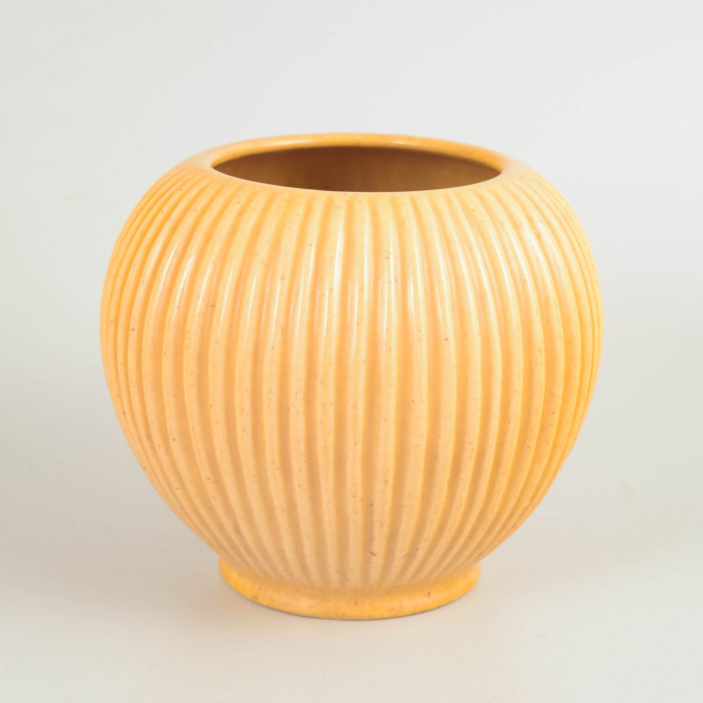 Skulpturel vase i drejet stentøj med markant lodret riflet korpus og afrundet, balusterformet silhuet. Den matte okker- til sandfarvede glasur understreger formens stringente, geometriske udtryk, karakteristisk for nordisk Art Deco og tidlig modernisme. Modellen er markeret 4616-3.