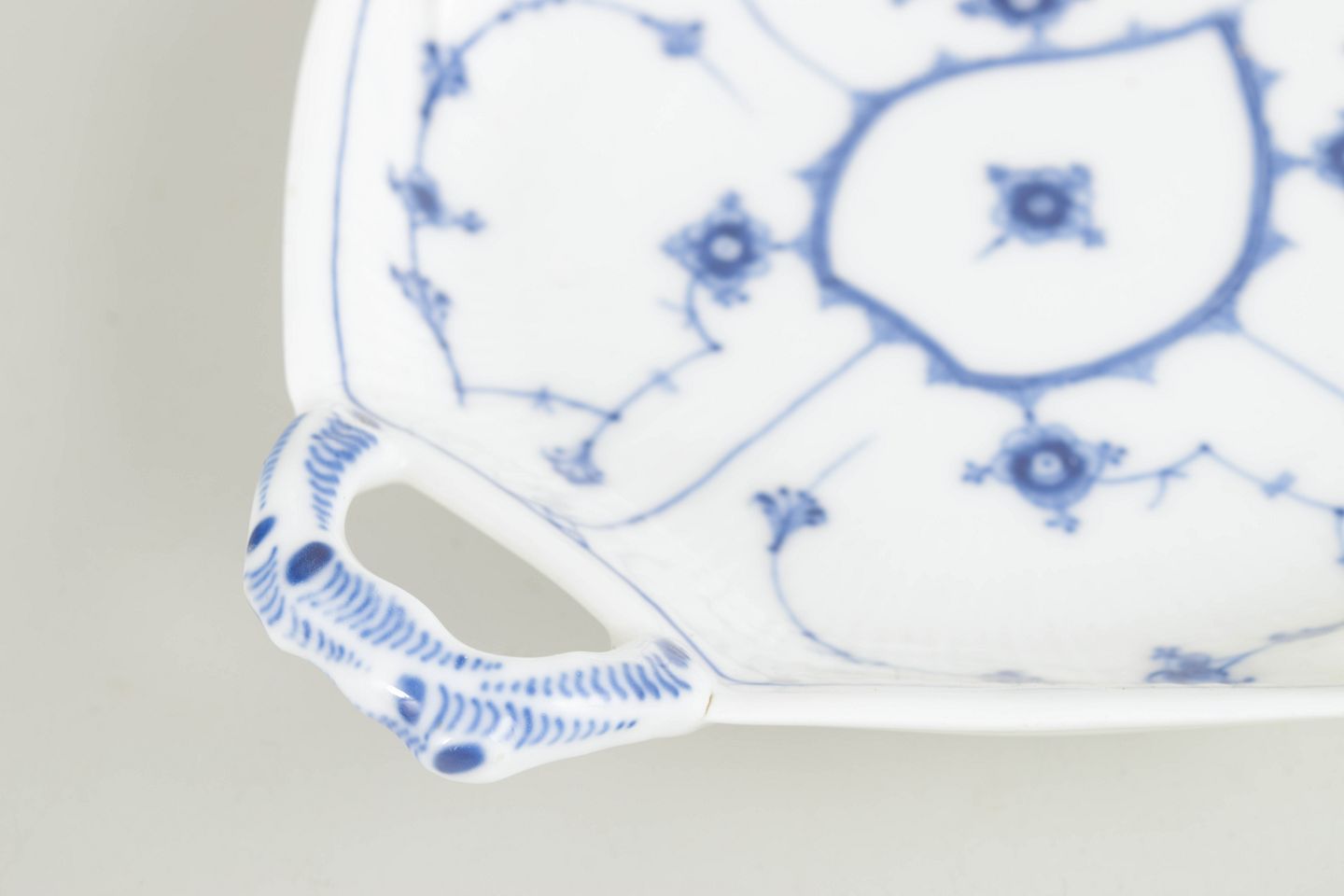 Tidligt antikt serveringsfad udført i Musselmalet riflet med håndmalet koboltblå underglasurdekoration på riflede porcelænsformer. Fadet er bladformet med let bølget kant og integreret greb, en form der var populær i midten af 1800-tallet til servering af mindre anretninger. Udført i 1. sortering.