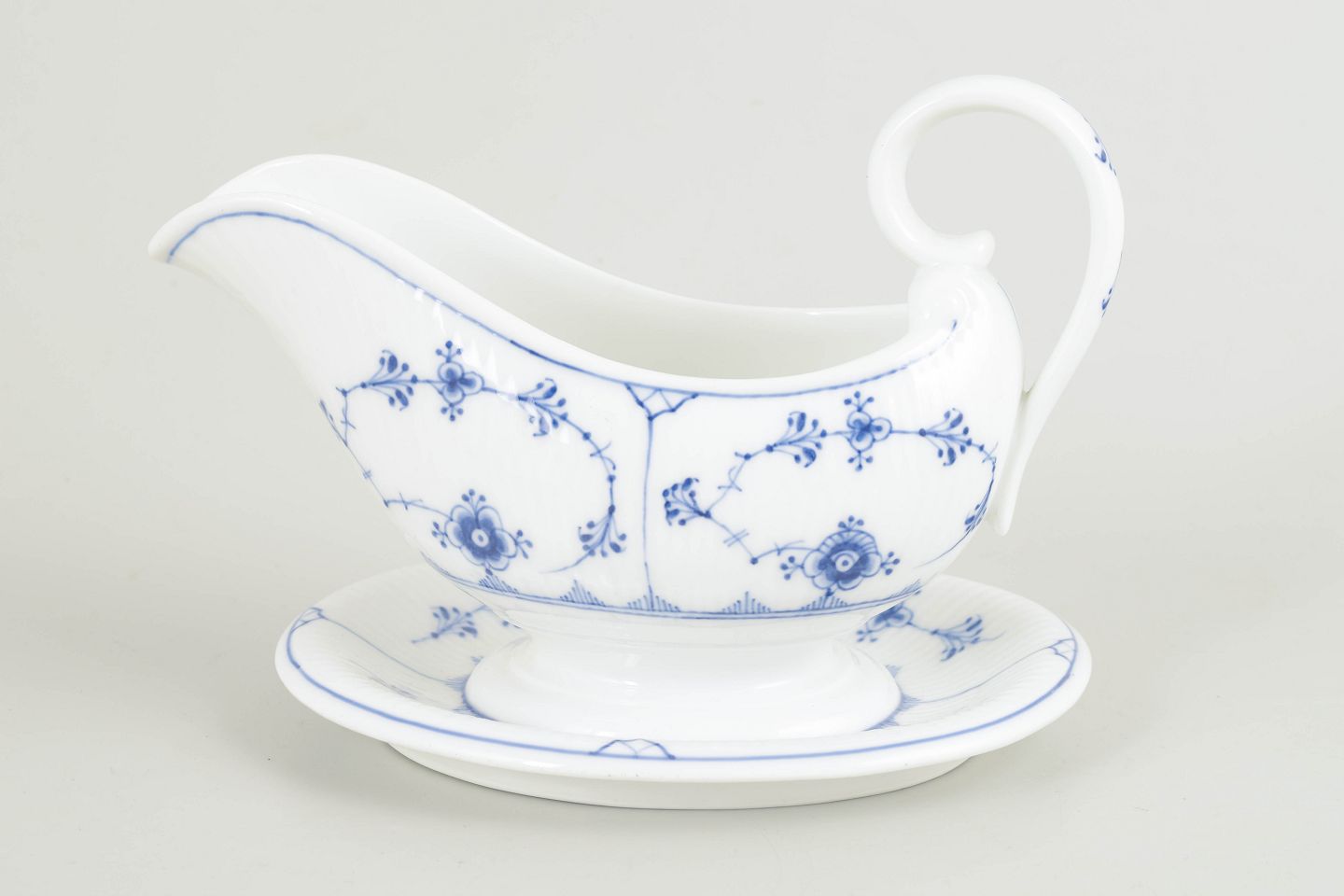 Elegant saucebåd i det klassiske stel Musselmalet riflet, dekoreret med håndmalet koboltblå underglasur på riflede porcelænsformer. Formen er harmonisk og velafbalanceret og beregnet til det formelle middagsbord i begyndelsen af 1900-tallet. Model 1/200, med tilhørende originalt underfad.