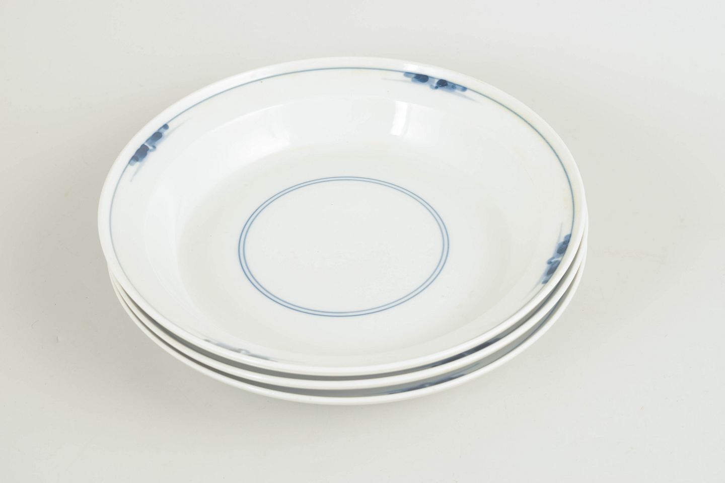 Sæt bestående af tre dybe tallerkener i Gemina-stellet, udført i hvidt porcelæn med diskret, grafisk dekoration i blå underglasur. En stram og moderne formgivning, der er karakteristisk for Royal Copenhagens produktion i 1960’erne.
