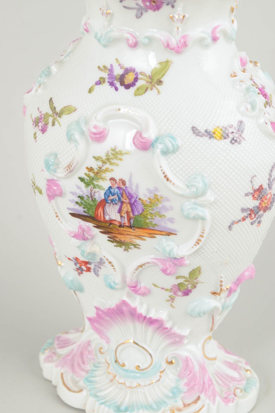 Sjælden vase i hvidt porcelæn rigt dekoreret i relief og med håndmalede polykrome blomster- og landskabsmotiver. Profileret fod og bølget munding. Et fint eksempel på Meissens dekorative porcelænskunst fra det tidlige 19. århundrede.