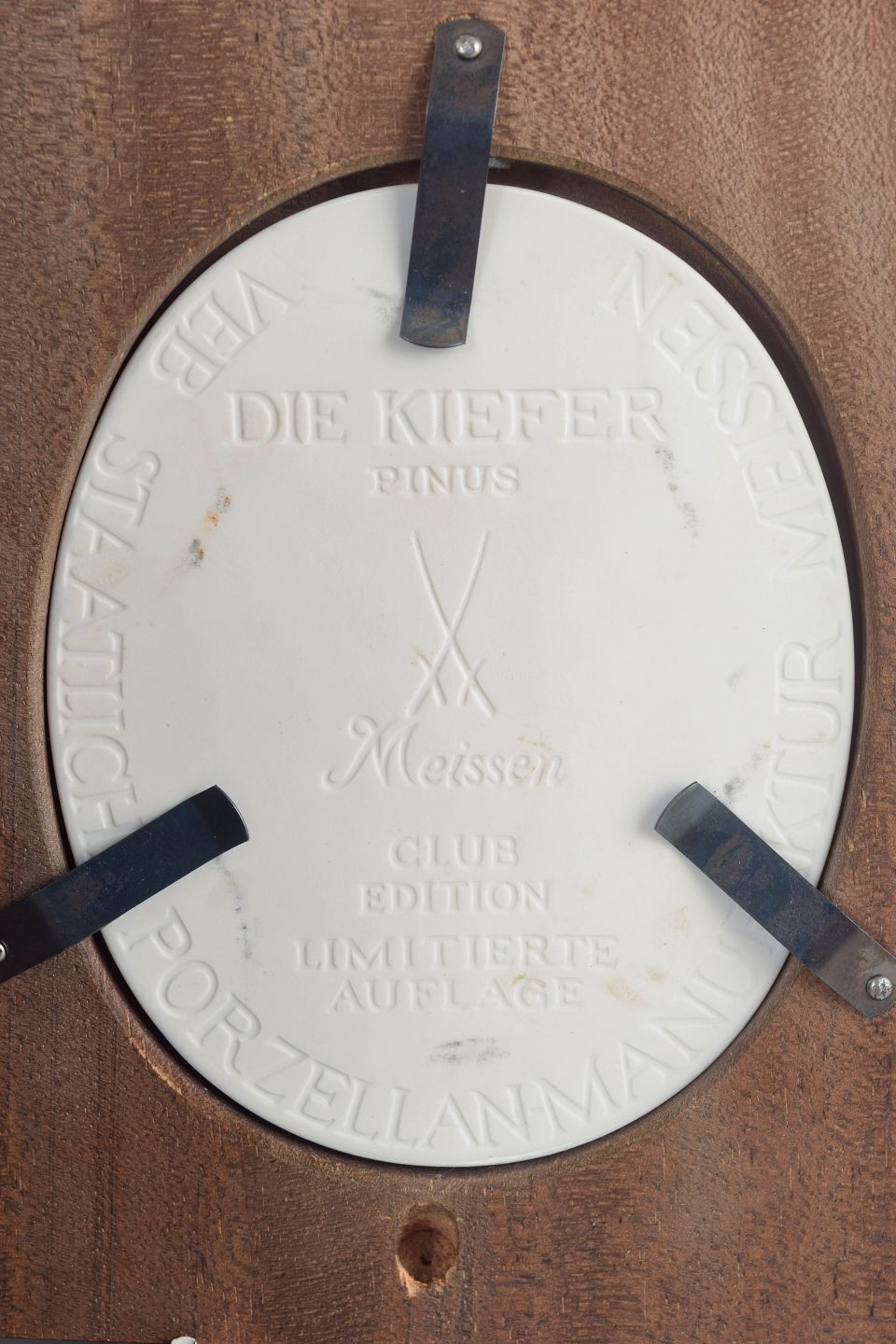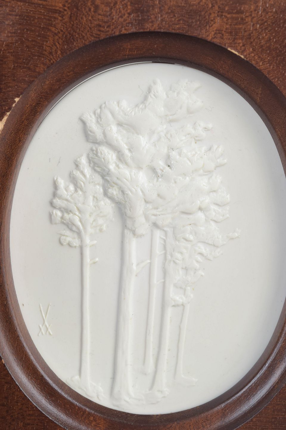 Reliefplakette i hvid biscuitporcelæn med stiliseret naturmotiv forestillende træer, monteret i rektangulær træramme med ovalt udsnit. Den matte overflade fremhæver relieffets fine modellering og giver et klassisk, skulpturelt udtryk.