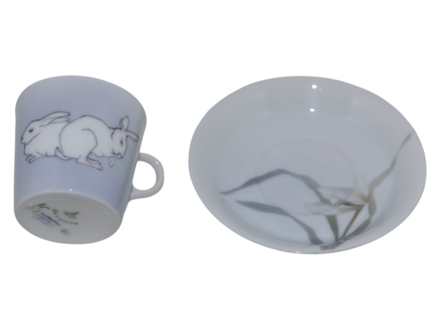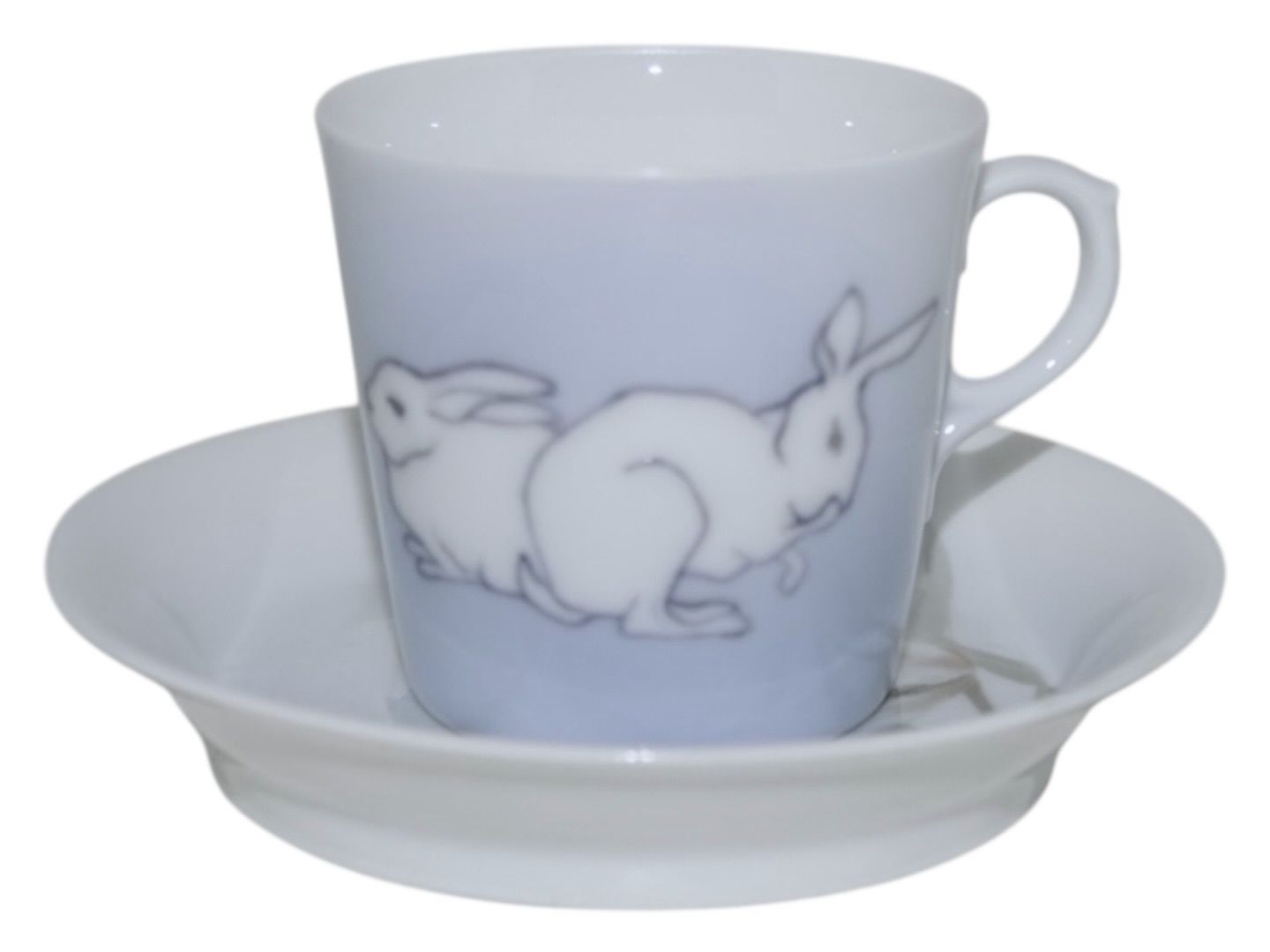 Royal Copenhagen Art Nouveau lille kaffekop med underkop. Koppen er dekoreret med to hvide kaniner.