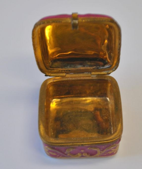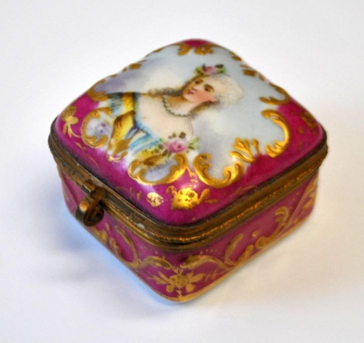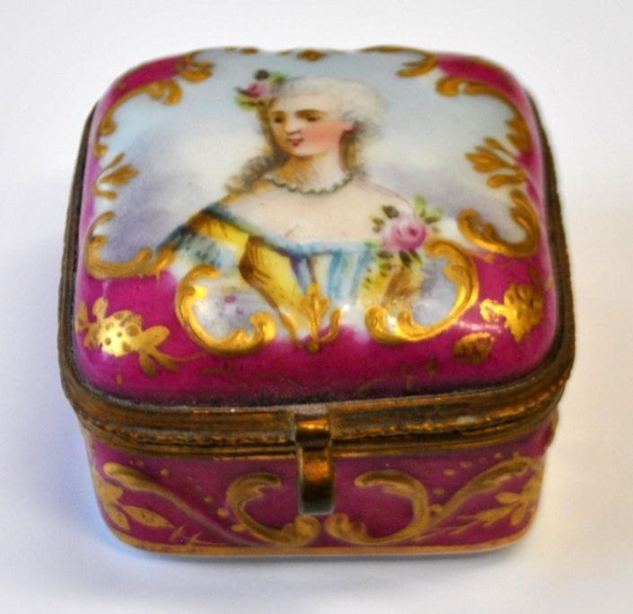 Pillendose aus Sèvres-Porzellan, 19. Jahrhundert. Frankreich. Handbemaltes Porzellan mit Rokoko-Frauenmotiv. Hellrot mit Rokoko-Vergoldung. Innen vergoldet. 4,5 x 4,5 x 3 cm. Einwandfreier Zustand!