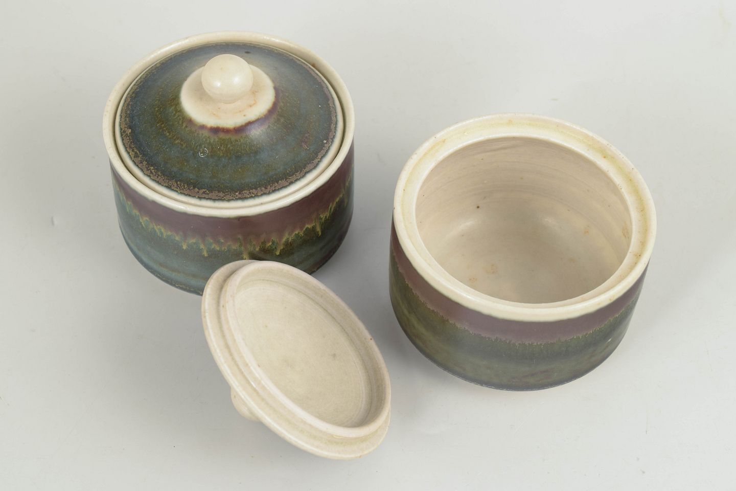 Par drejede lågkrukker i stentøj med cylindrisk form og tilpassede låg med knop. Udført med levende, flerlaget glasur i afdæmpede nuancer af grøn, blå og brun med lys rand og markant horisontalt glasurspil. Signerede i bunden og produceret hos Höganäs i 1970’erne.