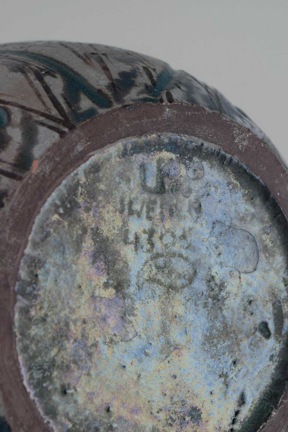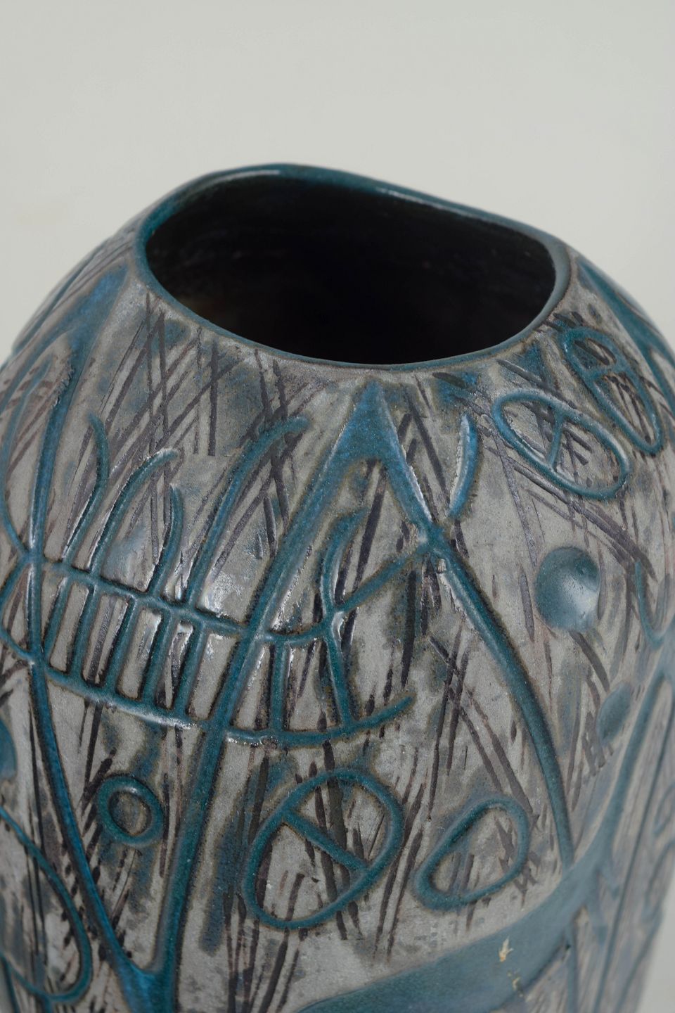 Dekorativ vase i glaseret keramik med reliefdekoration i blågrønne nuancer mod grå bund. Overfladen er rigt ornamenteret med stiliserede figurer og symbolske motiver, karakteristisk for Mari Simmulsons arbejder fra 1960’erne. Vasen er udført som model 4305 fra serien Hedenhös og fremstår med et tydeligt kunstnerisk og fortællende udtryk.