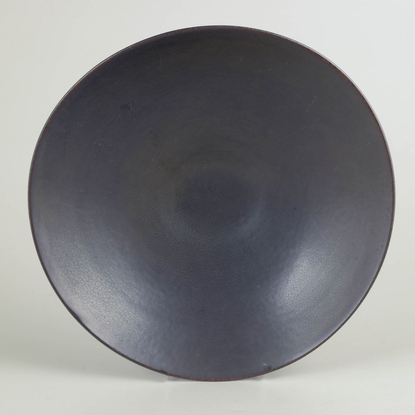 Stor, lav skål i stentøj med bred, åben form og let hævet fodring. Udført i afdæmpet, mørk glasur med mat overflade, der fremhæver den rene silhuet og den sikre proportionering. Et karakteristisk eksempel på Carl-Harry Stålhanes modernistiske formsprog hos Rörstrand i midten af det 20. århundrede, hvor enkelhed og materialefornemmelse er i fokus.