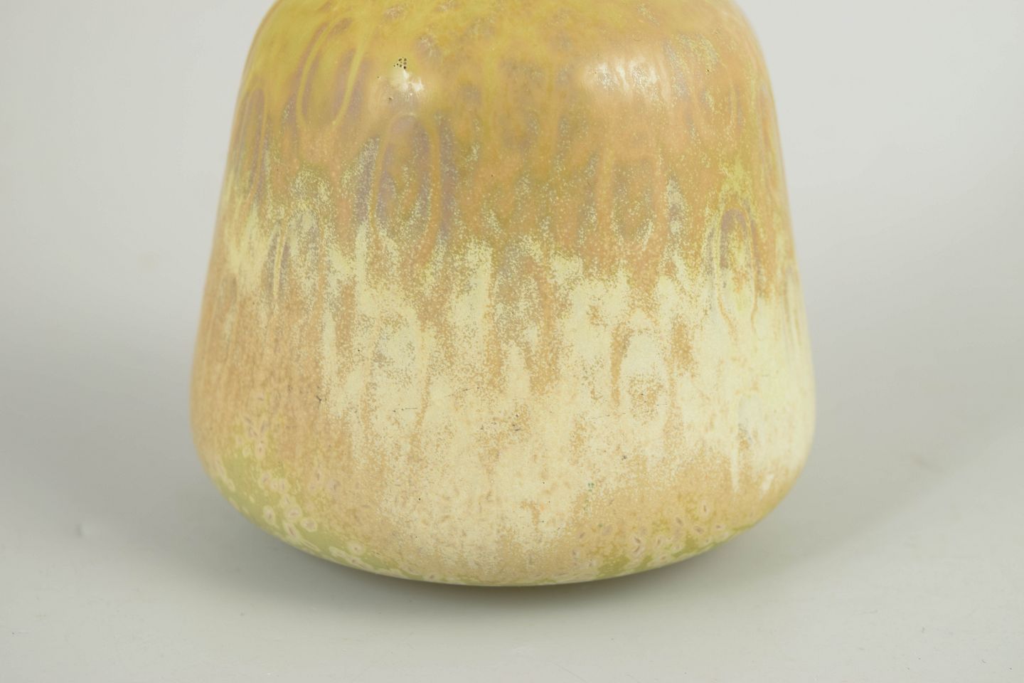 Elegant og balanceret vase i stentøj med blød, organisk form. Udført med karakteristisk lys, spættet glasur i kølige blålige og cremefarvede nuancer, typisk for Gunnar Nylunds produktion hos Rörstrand i midten af det 20. århundrede. Harmonisk proportioneret med let udadbøjet munding.