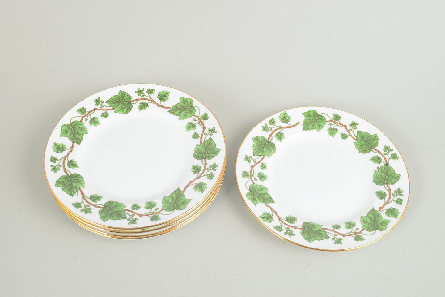 Dekorative fajancetallerkener med grøn vedbend dekoration og guldkant, produceret i Staffordshire, England.