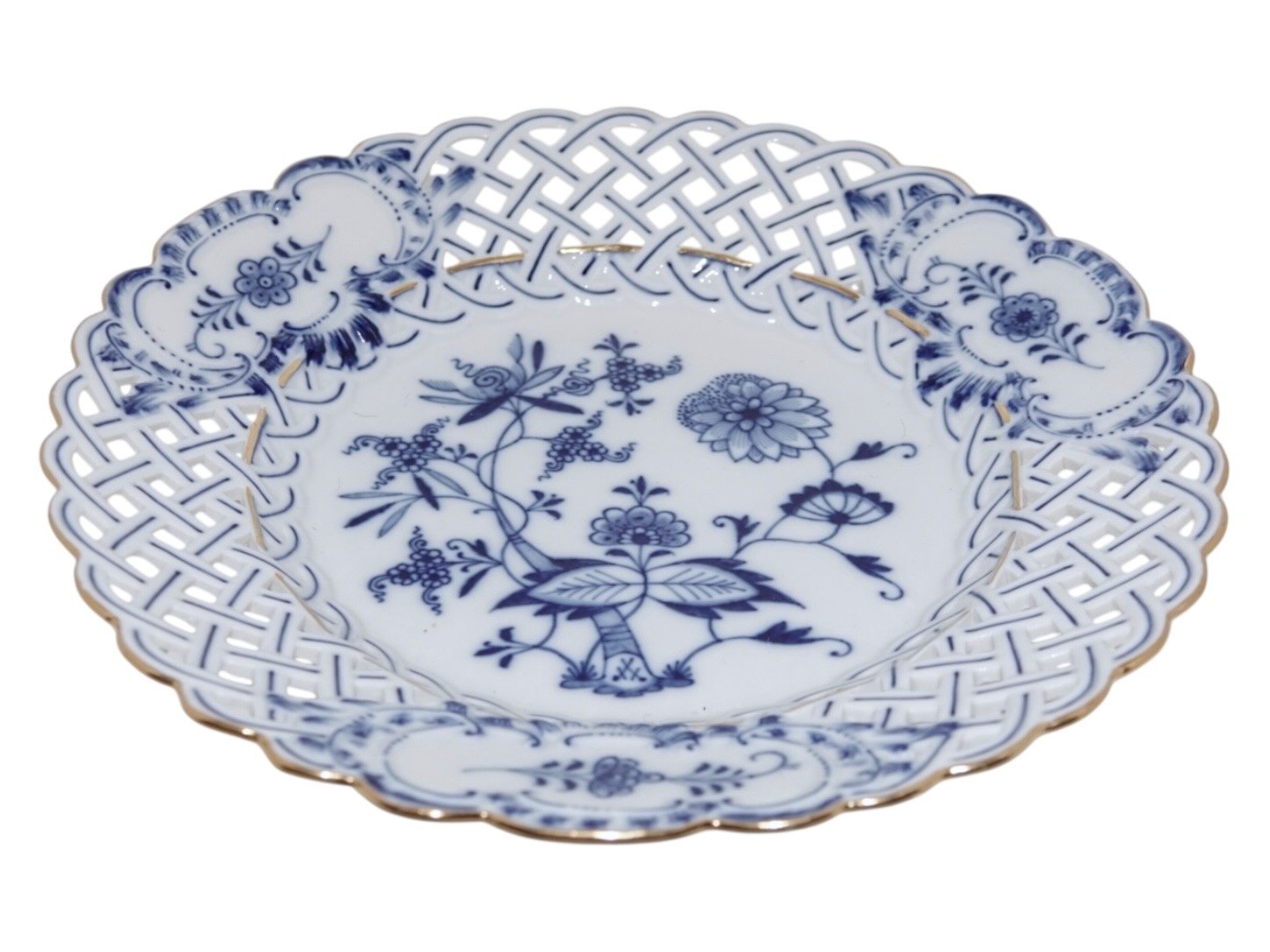 Meissen Tyskland, Blue Onion tallerken med dobbeltblonde og guldkant.