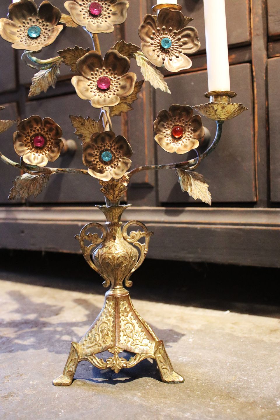 Antik Fransk kirkelysestage med plads til 5 stearinlys , dekoreret med masser af forgyldte blomster med farvet glassten.