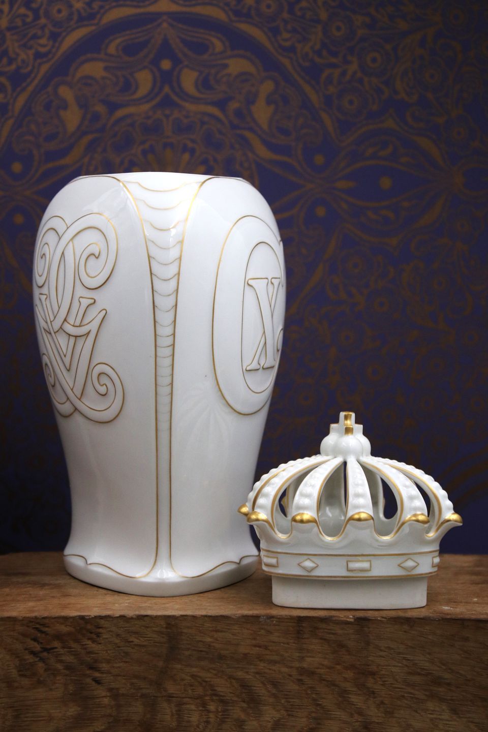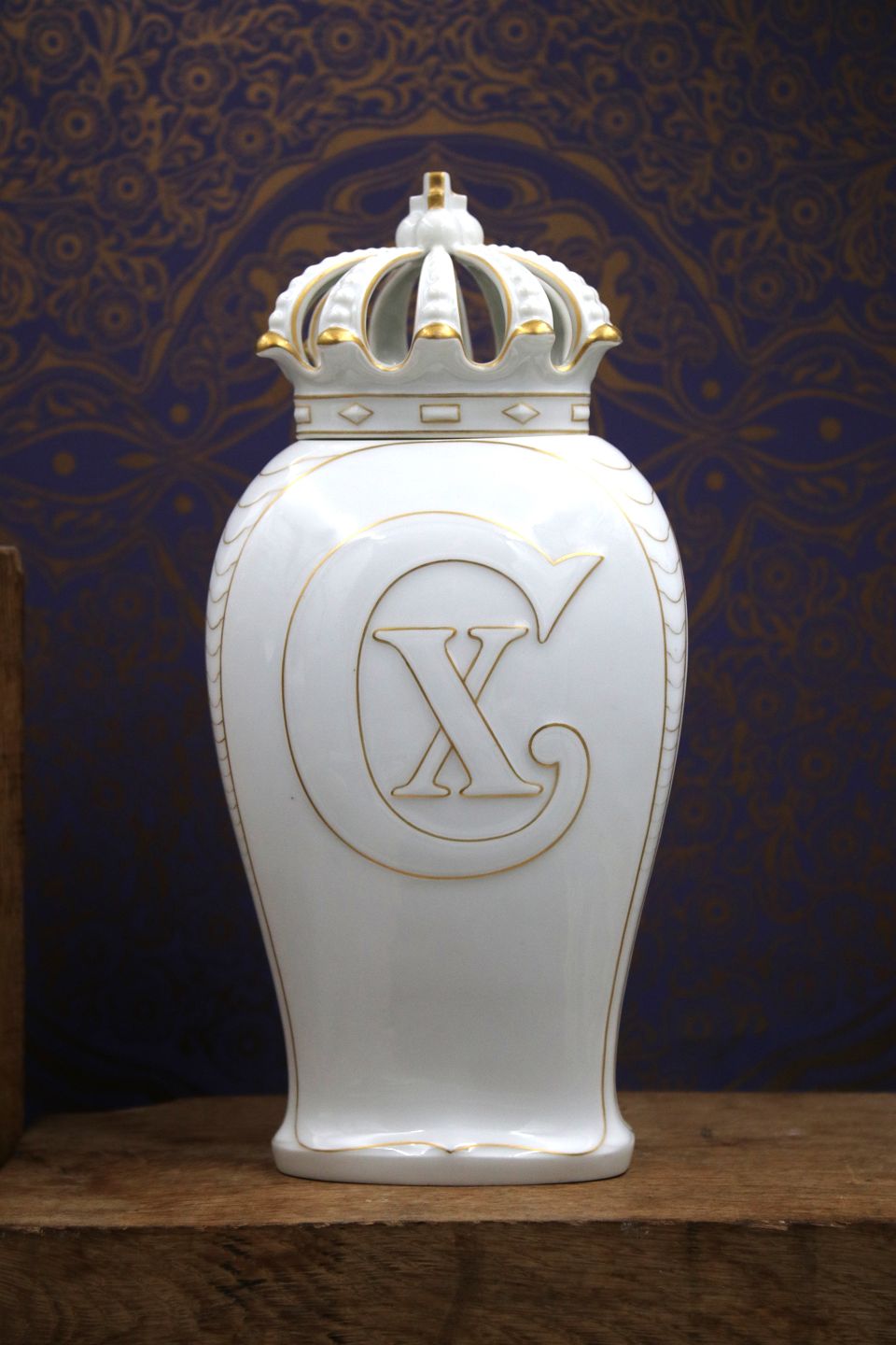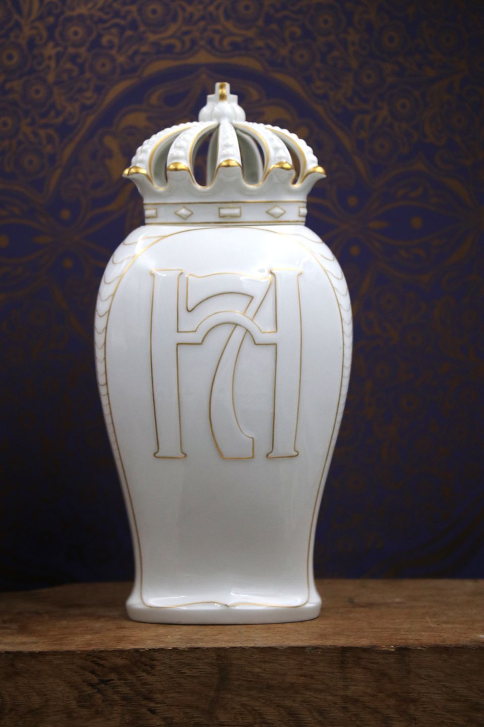 Gammel Bing & Grøndahl vase / lågkrukke i hvid porcelæn med kongekrone på toppen , guld dekorationer
