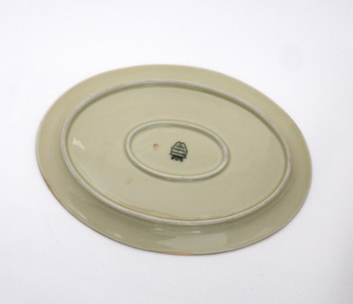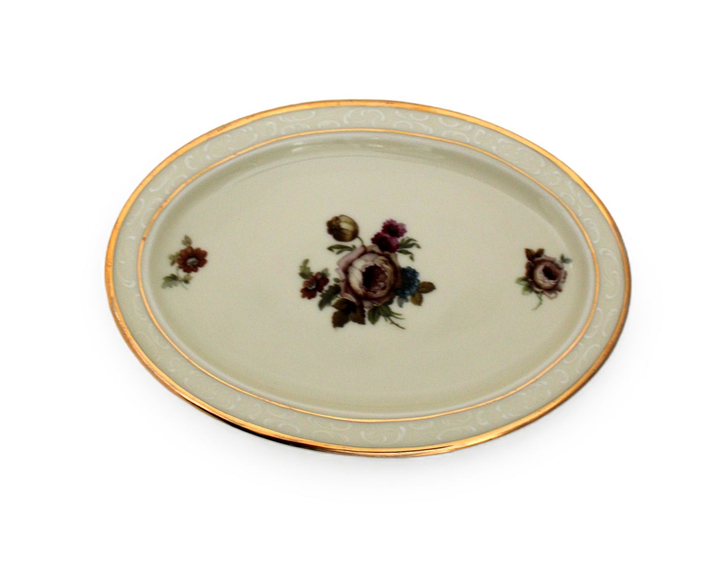 Text zugänglich auf Dänische: Kjøbenhavns Porcellains Maleri, Rosenborg, Ovalt lille fad. Længde 25,5 cm. Bredde 18 cm. Lettere brugsslid på guldkant. Pris: 150 kr. stk. Lager: 1