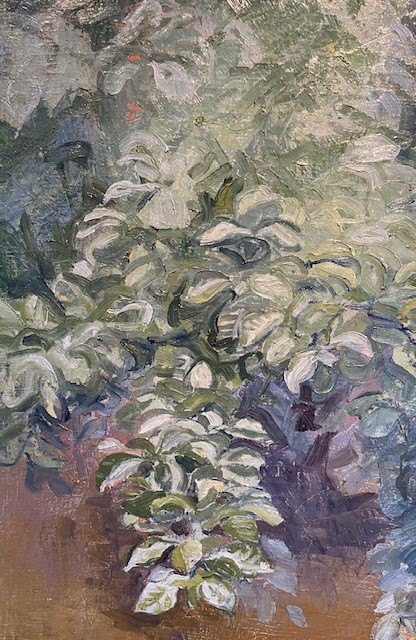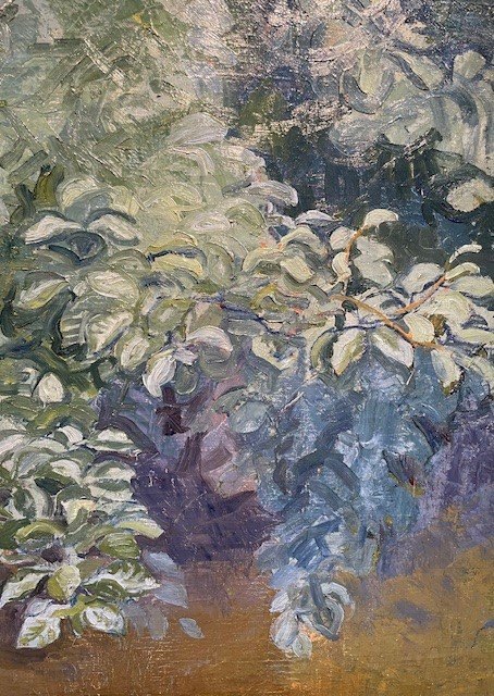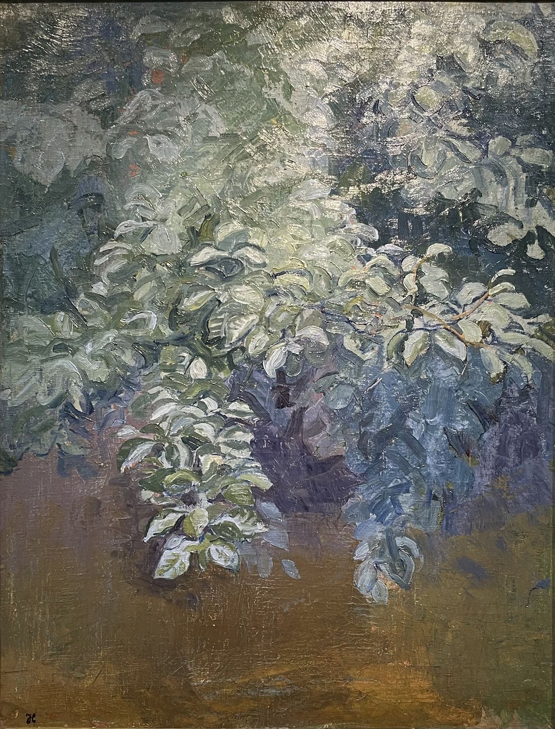 Text zugänglich auf Dänische: "Bøge ved en aa" Oliemaleri, et tidligt værk, muligvis har kunstnerens Hustru Alhed Larsen 1872-1927 været med i processen i at udføre dette sjældne værk.