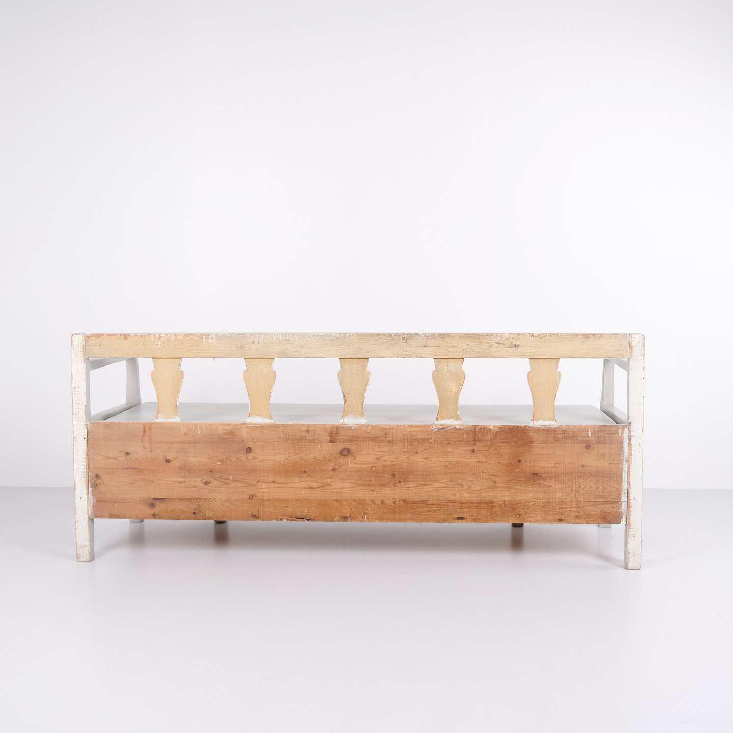 Antike Schlagbank aus den 1860er Jahren aus grau gestrichener Kiefer. Klassisches Volksdesign mit Sitzfläche und Stauraum. Historisches und funktionales Möbelstück.