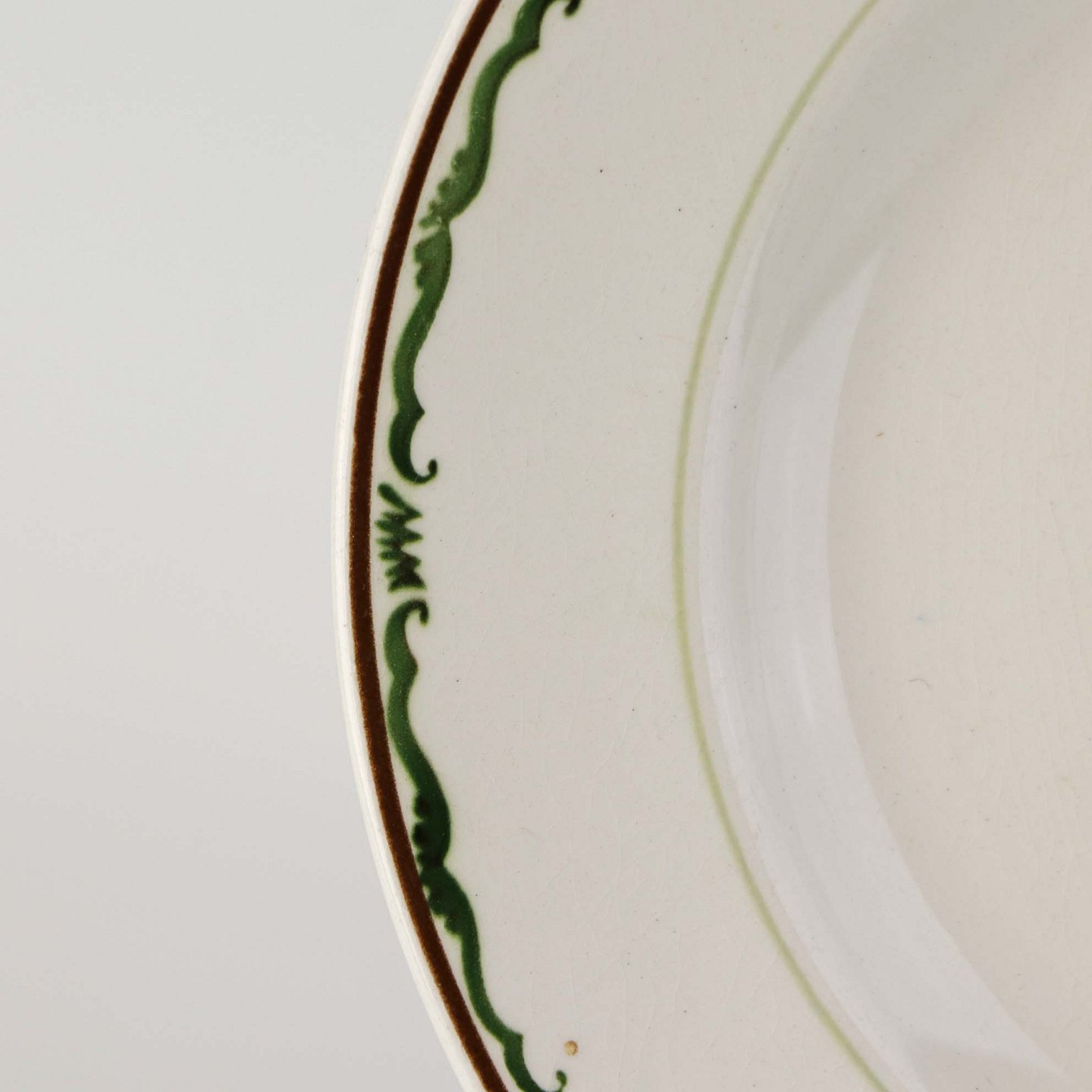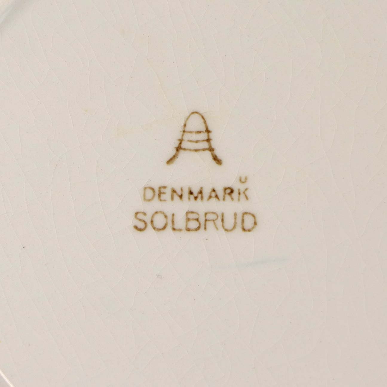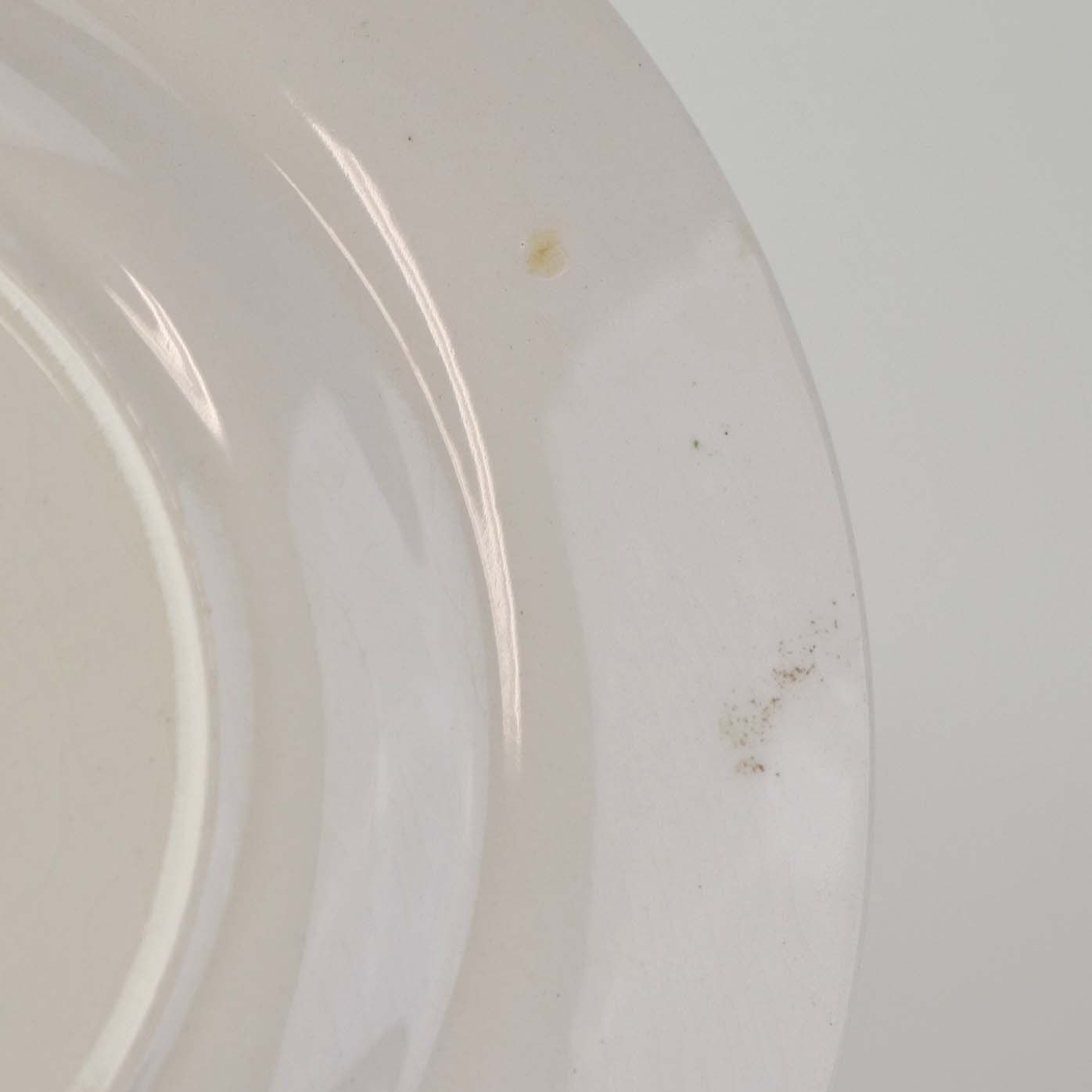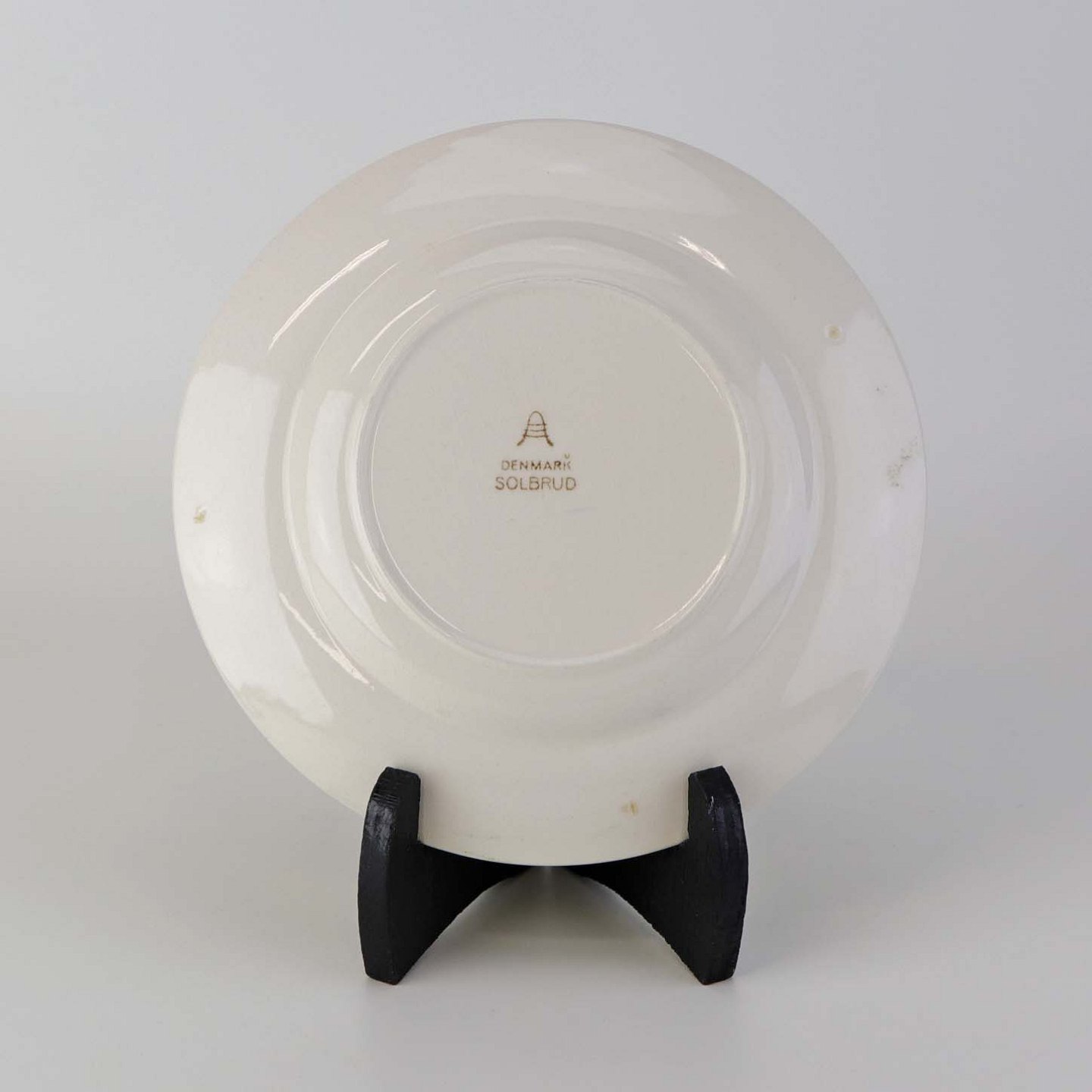 Fremstår med krakkeleringer i glasuren og mindre områder på bagsiden af tallerknen med bruneringer under glasuren.
