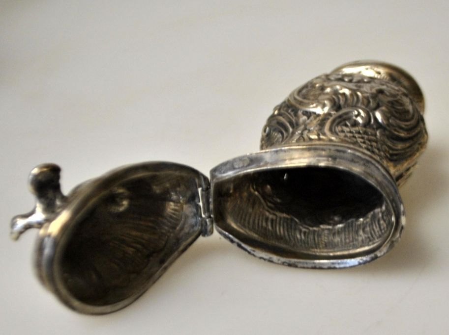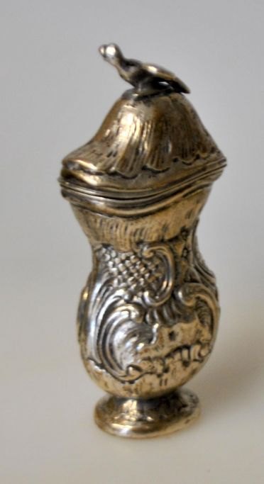 Dänischer Silberschmied (18. Jahrhundert). Rokoko Vinagrette mit Taube. Mit zahlreichen Rocaille-Verzierungen. Unpunziert. Höhe: 8,5 cm.