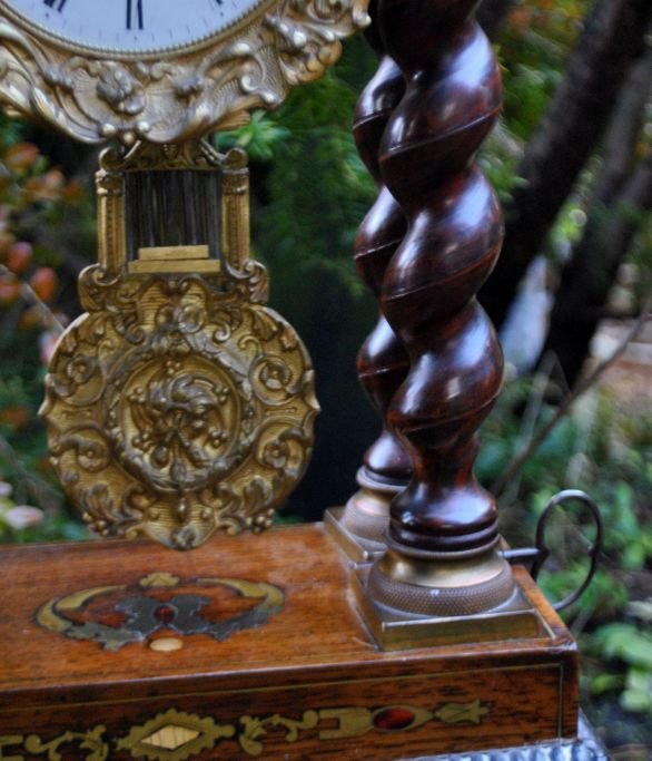 Säulenuhr aus Ebenholz, Messing und mit Intarsien, um 1830. Frankreich.