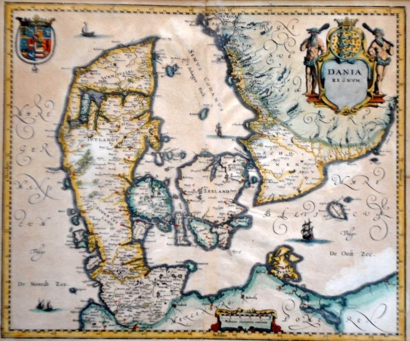 Willem Janszoon Blau (1571–1638), Niederlande: Übersichtskarte von Dänemark. 1634. Kupferstich, handkoloriert. Unsigniert. 28 × 33 cm.