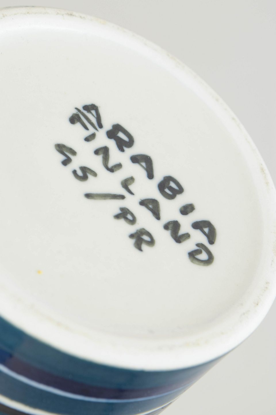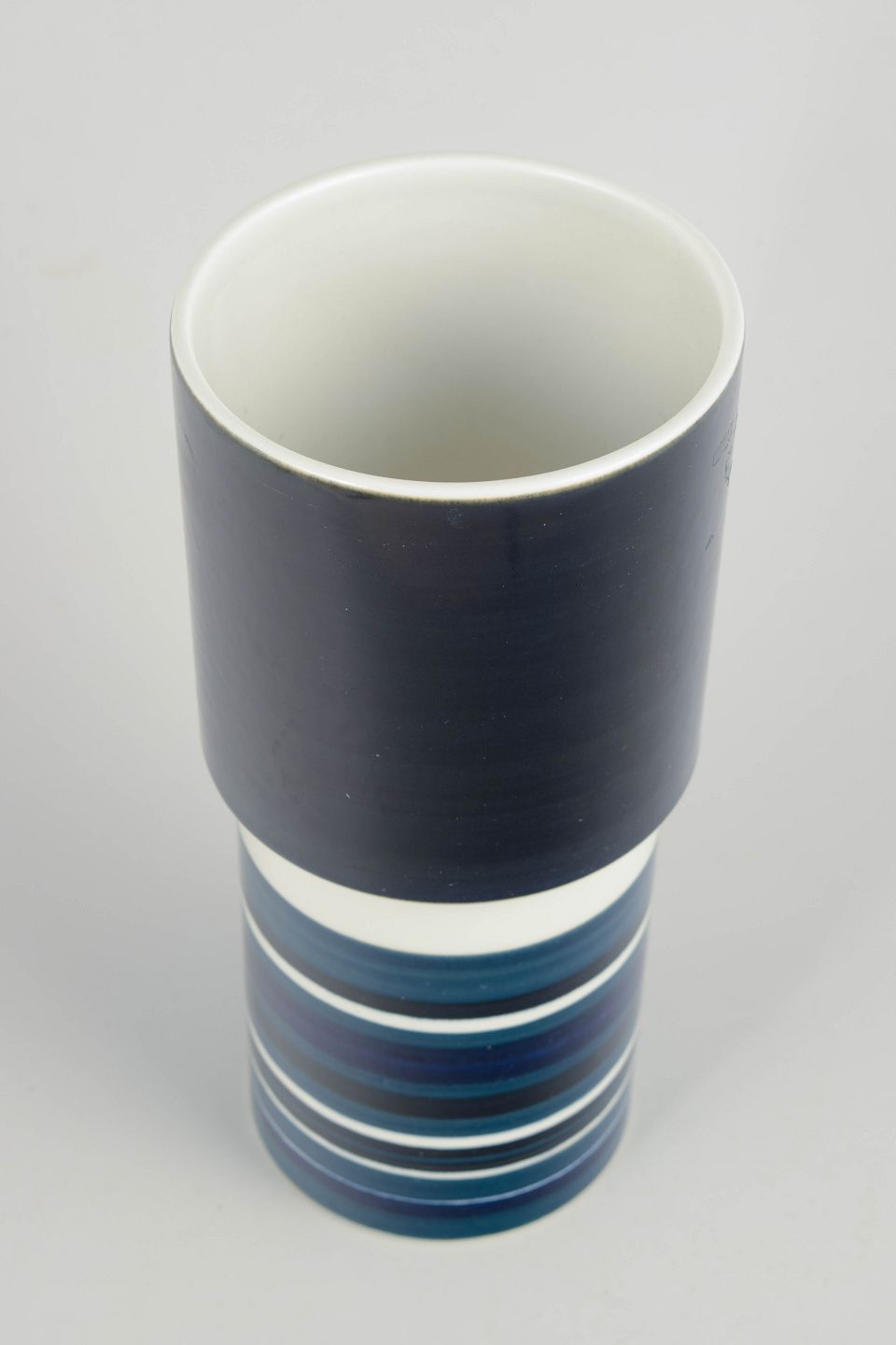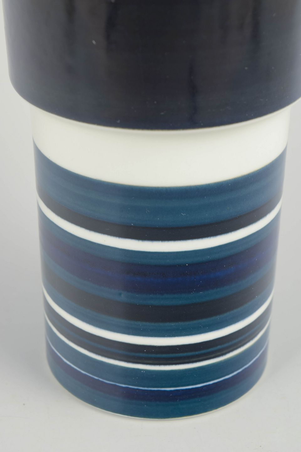 Høj, cylindrisk vase i glaseret stentøj med grafisk feltinddeling, bestående af en dyb, mørk glasur i den øvre del og horisontale striber i blå, grå og hvide nuancer nederst. Modellen er signeret GS/PR.