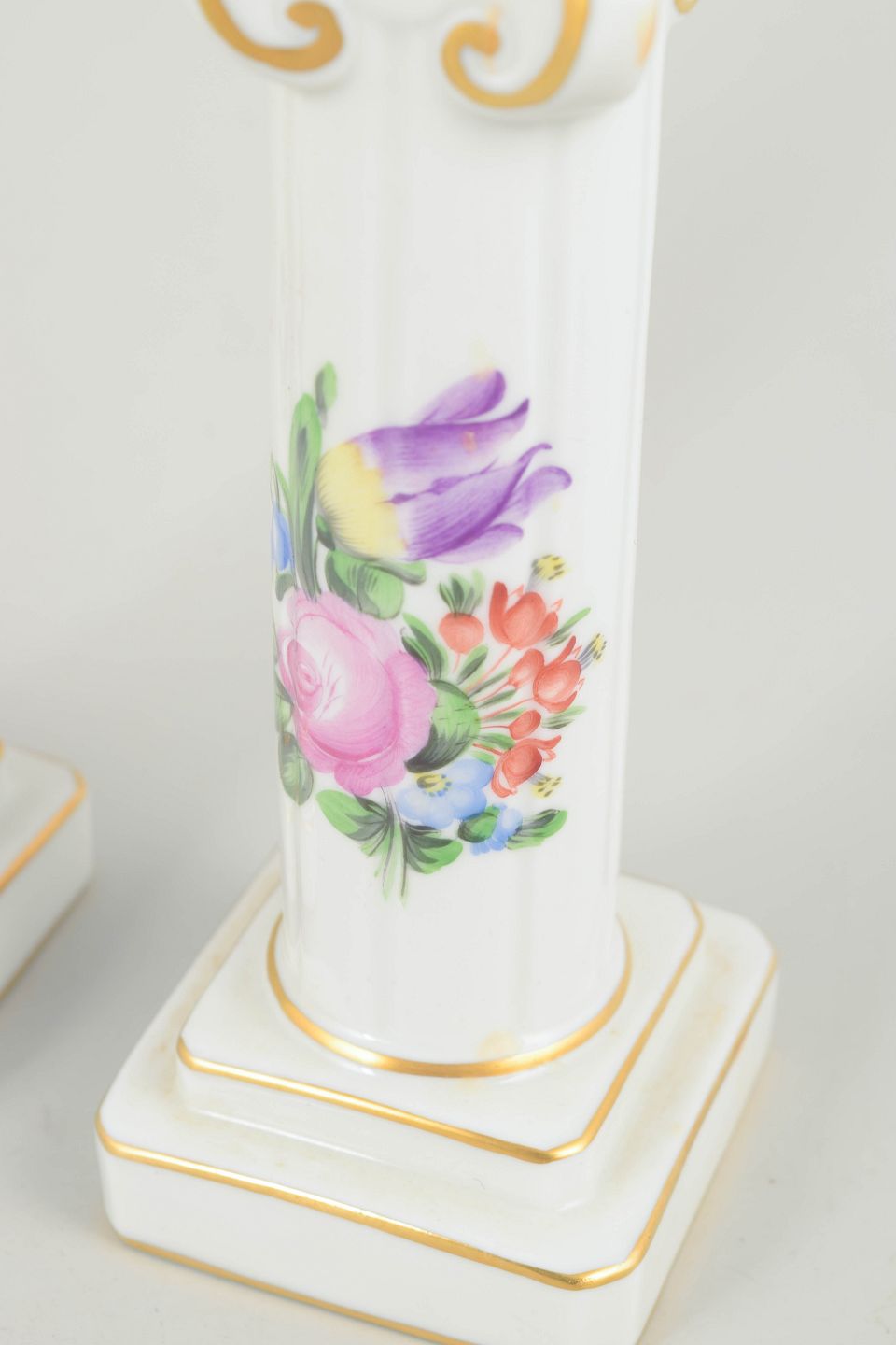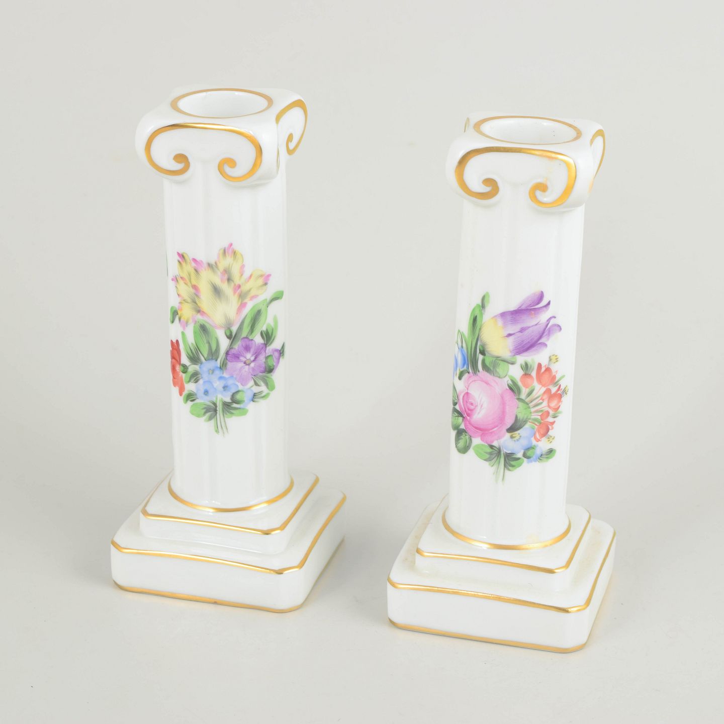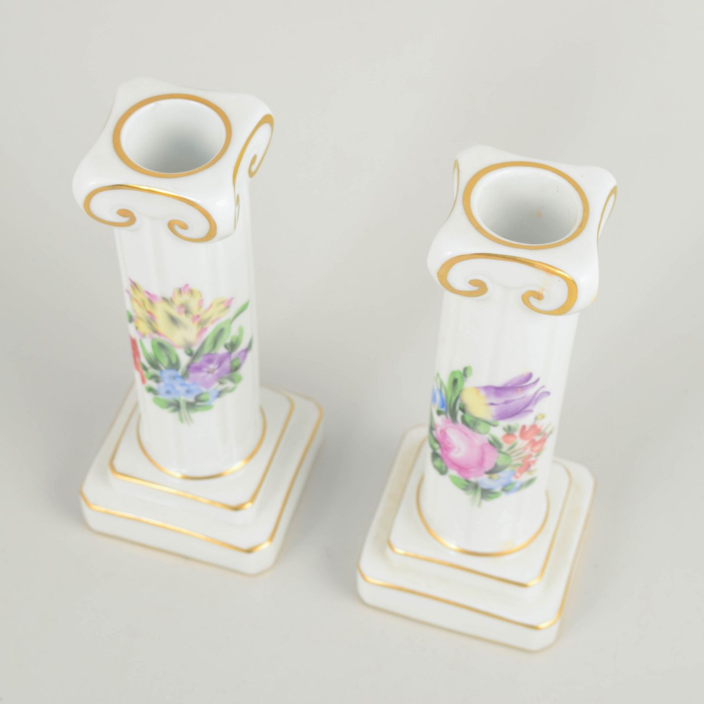 Håndmalet par lysestager i glaseret porcelæn med blomsterdekorationer i rosa, lilla, blå og grønne nuancer. Slanke, balusterformede søjler på kvadratiske fødder med profilerede detaljer og diskret forgyldning langs kanter og ornamentik. Hver stage er individuelt dekoreret med varierende blomstersammensætninger.