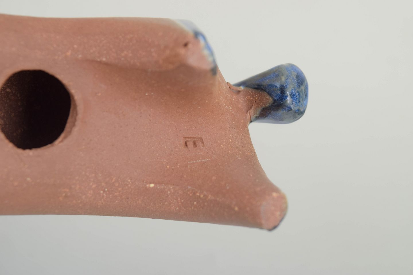 Stiliseret hest i stentøj med kompakt, arkitektonisk form og bløde, afrundede konturer. Udført med mat, sandfarvet glasur kombineret med dæmpede blå og lyse nuancer, karakteristisk for Lisa Larsons formsprog. Figuren er fra 1970’erne og bærer originalt Gustavsberg-mærke.