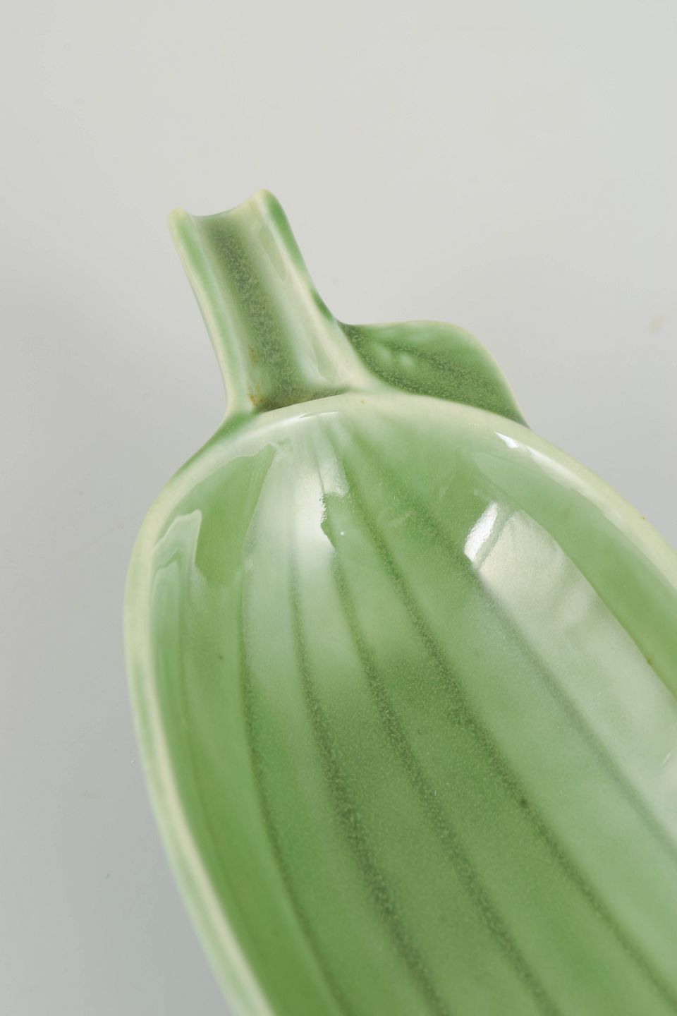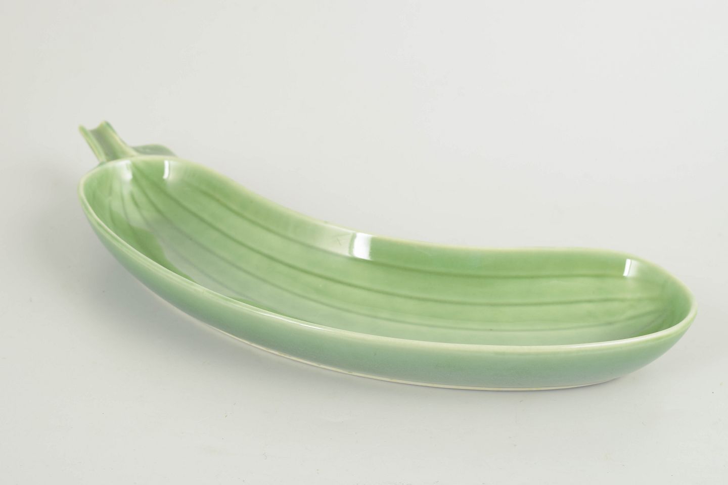 Langstrakt, naturalistisk formet fad i glaseret fajance udført som en agurk, med markante ribber og blank grøn glasur i varierende nuancer. Et karakteristisk og humoristisk design fra Stig Lindbergs sene produktion hos Gustavsberg, udført i 1970’erne. Modellen er kendt som “Cucumber”.