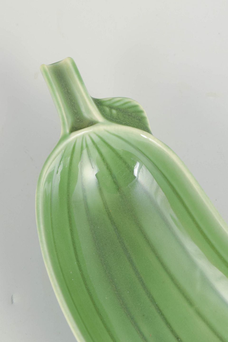 Langstrakt, naturalistisk formet fad i glaseret fajance udført som en agurk, med markante ribber og blank grøn glasur i varierende nuancer. Et karakteristisk og humoristisk design fra Stig Lindbergs sene produktion hos Gustavsberg, udført i 1970’erne. Modellen er kendt som “Cucumber”.