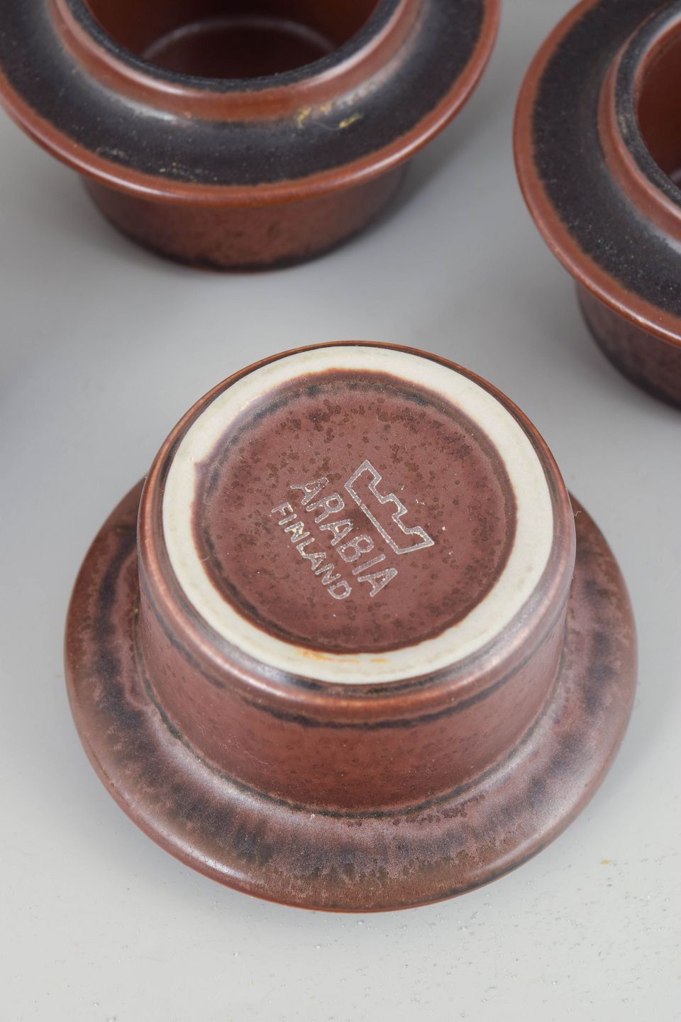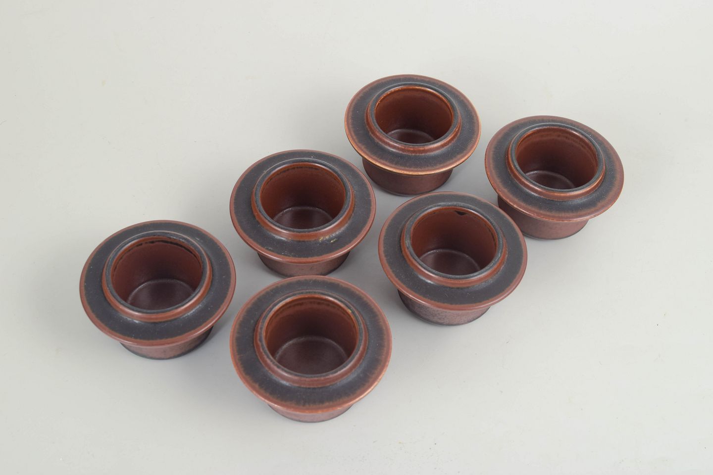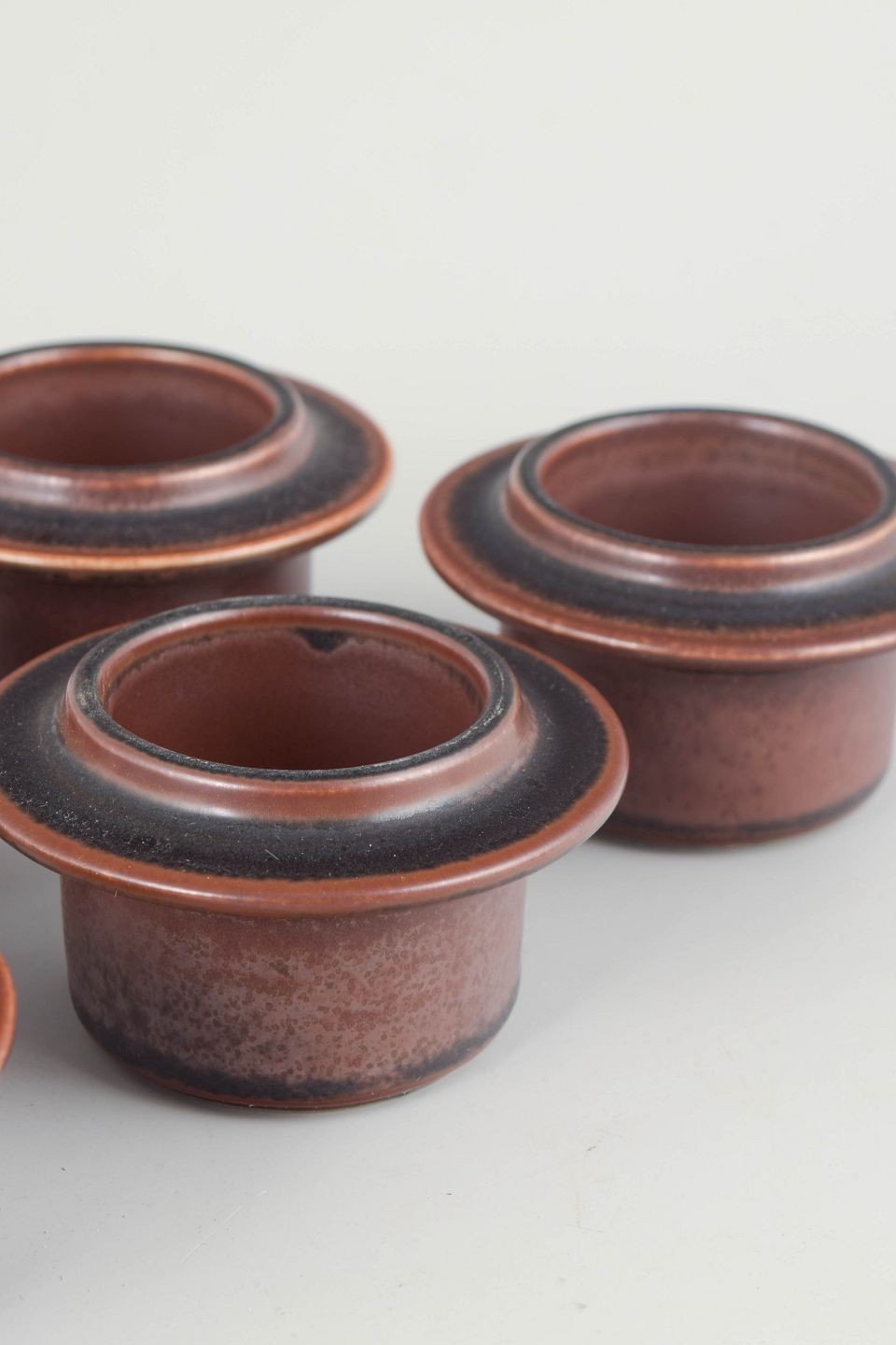 Sæt bestående af seks æggebægre i stentøj fra Ruska-serien hos Arabia, udført med den karakteristiske, melerede brune glasur i varme jordtoner. Kompakt, cylindrisk form med let udkravet kant, designet til fyrfadslys. Glasuren varierer naturligt og giver hvert stykke et individuelt udtryk.
