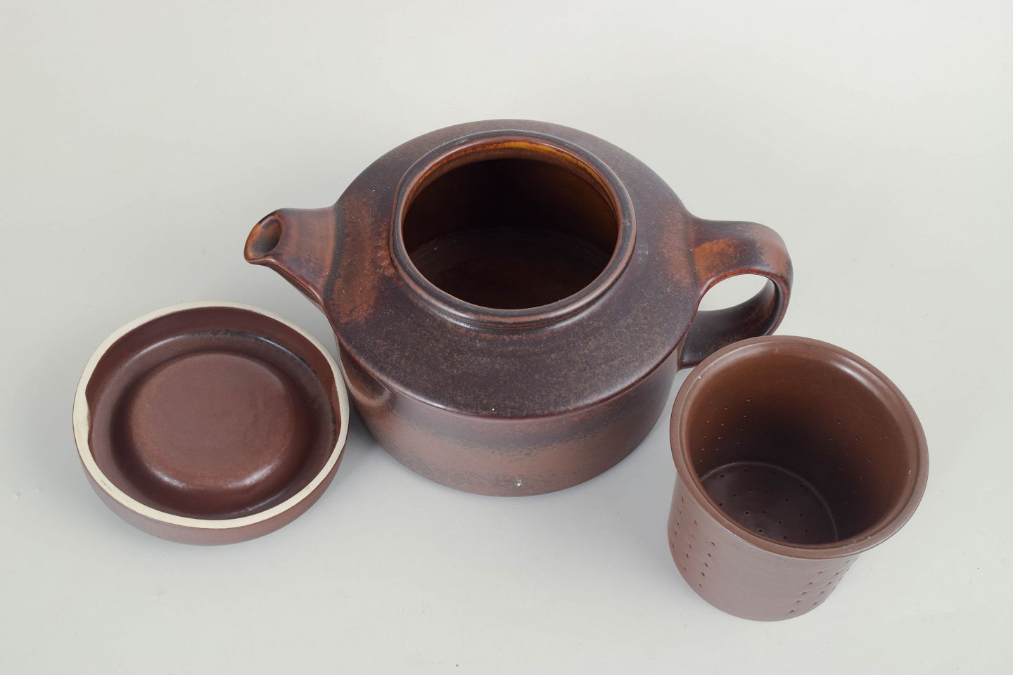 Kompakt tekande i stentøj fra Arabia, udført i serien Ruska med karakteristisk, meleret brun glasur i varme jordtoner. Lav, cylindrisk form med integreret tud, bred hank og fladt låg med ringgreb.