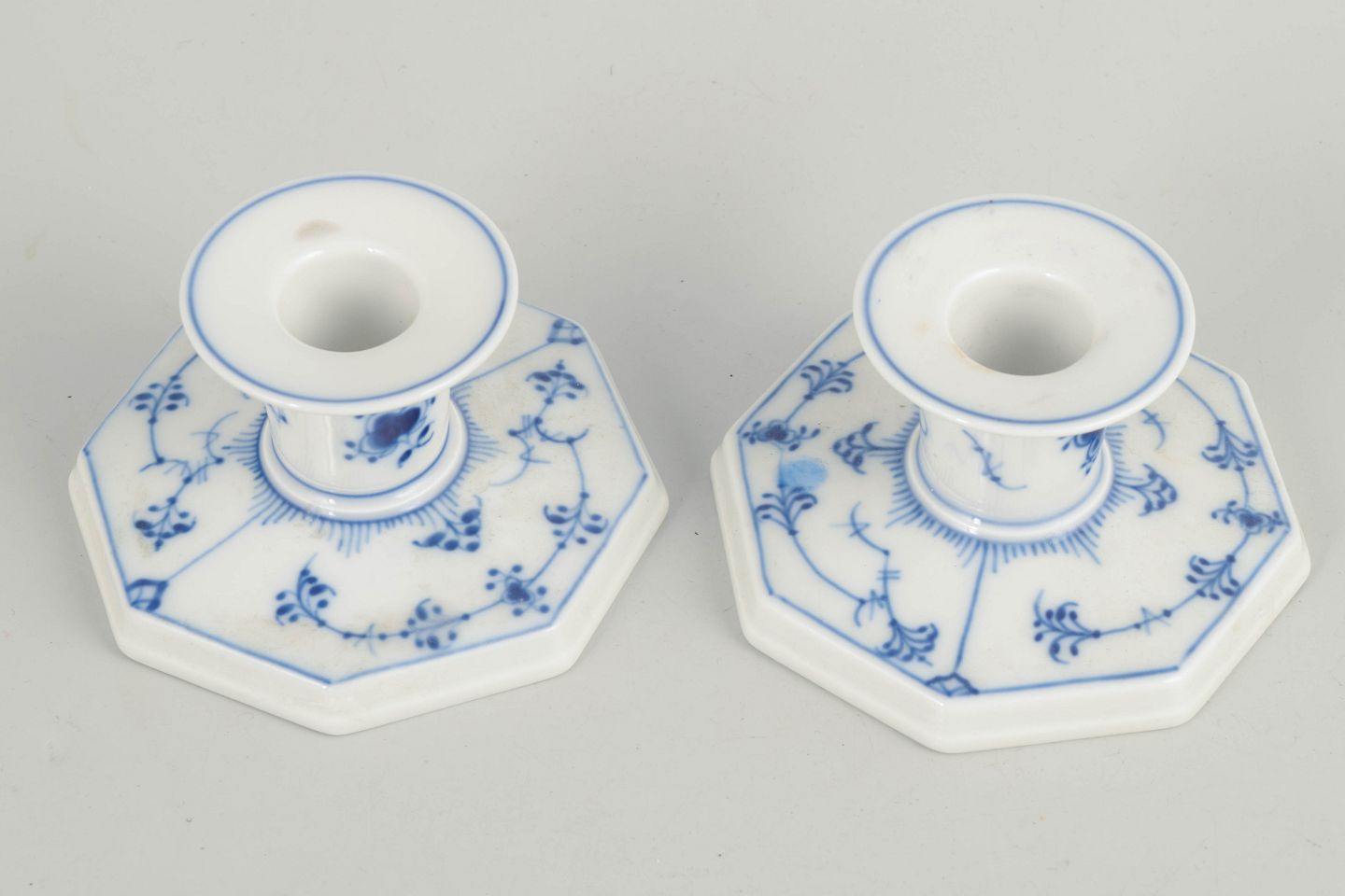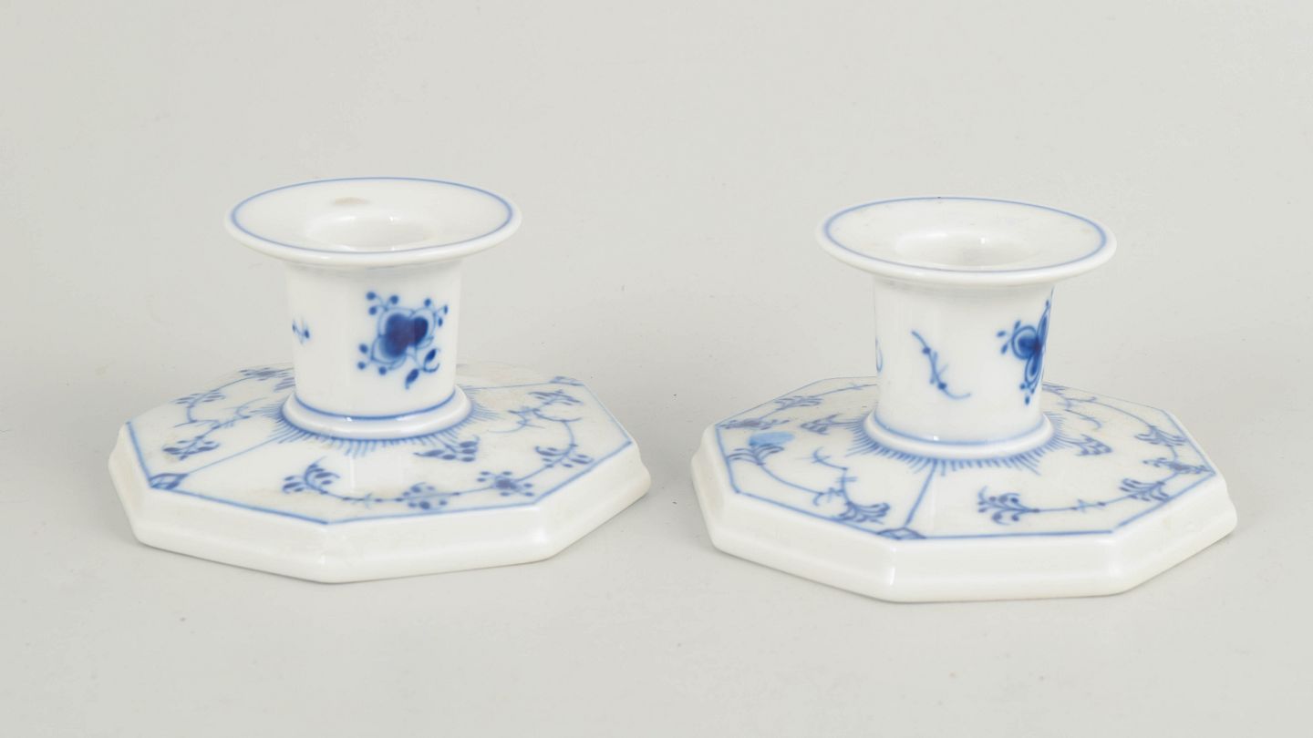 Par rillede lysestager i glaseret porcelæn med håndmalet underglasurdekoration i koboltblå. Ottekantet fod med lav, balanceret profil og cylindrisk lysholder. Model 1/3334.
