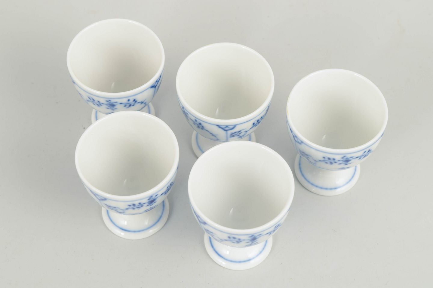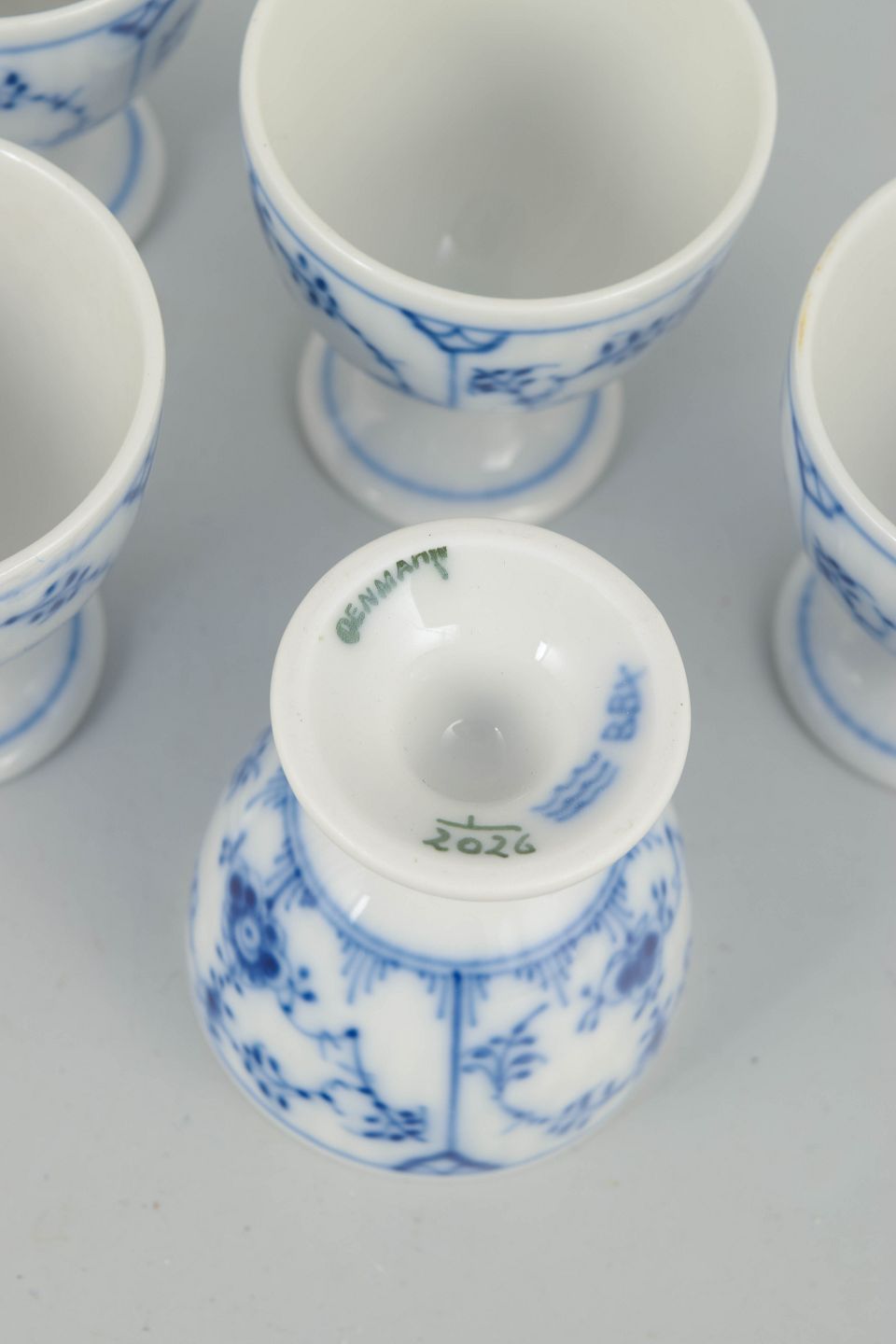 Sæt bestående af fem rillede æggebægre i glaseret porcelæn med håndmalet underglasurdekoration i koboltblå. Klassisk fodet form med let udsvajet kumme. Model 1/2026.
