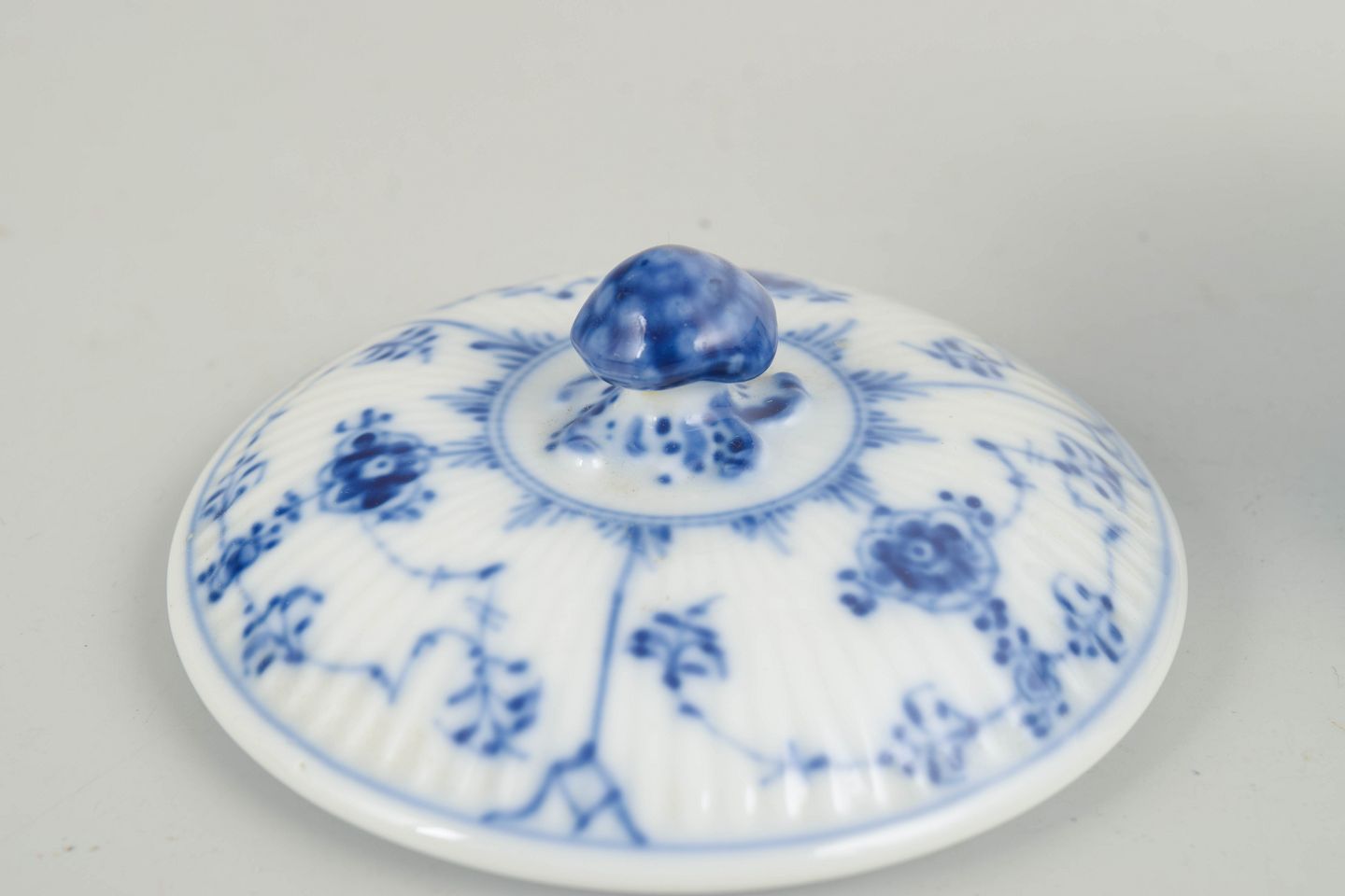 Rillet sukkerskål i glaseret porcelæn med håndmalet underglasurdekoration i koboltblå. Klassisk rund form med tilhørende låg afsluttet med knop. Model 1/239.