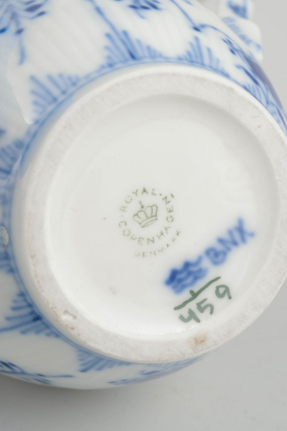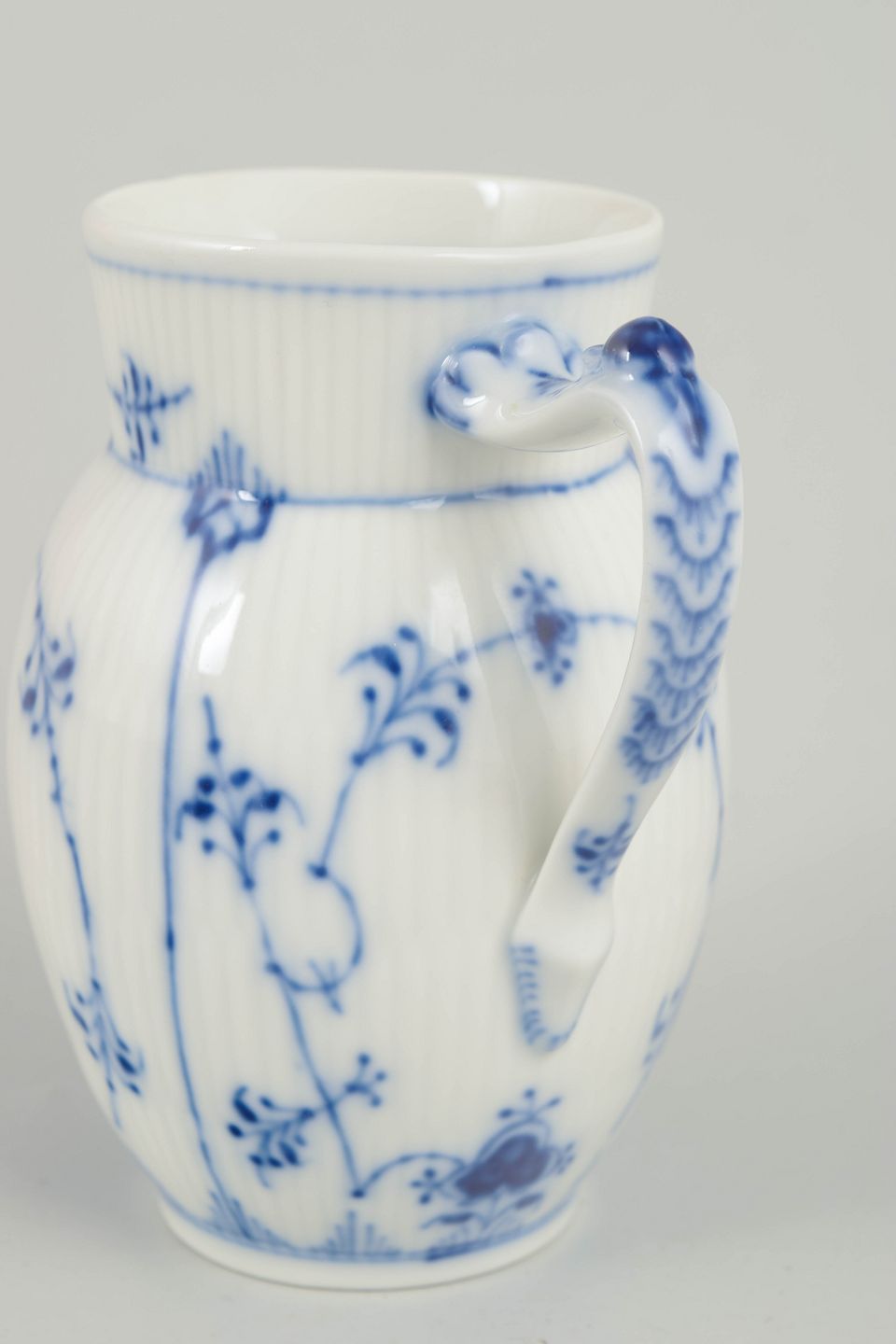 Rillet flødekande i glaseret porcelæn med håndmalet underglasurdekoration i koboltblå. Klassisk balusterform med svunget hældetud og dekorativ hank. Model 1/459.