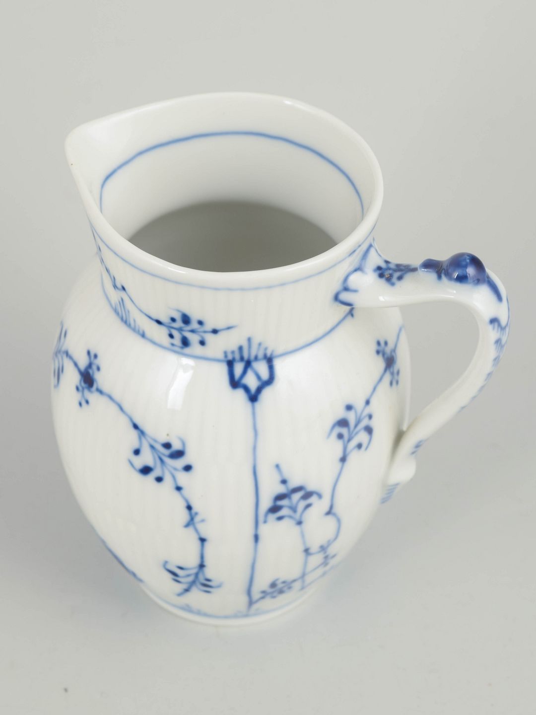 Rillet flødekande i glaseret porcelæn med håndmalet underglasurdekoration i koboltblå. Klassisk balusterform med svunget hældetud og dekorativ hank. Model 1/459. 1980´erne.