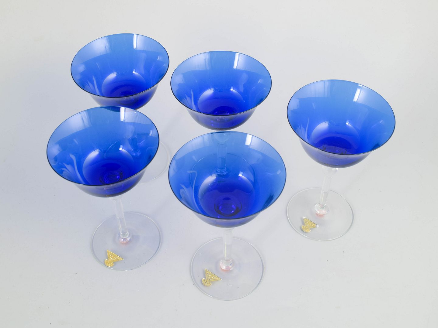Sæt bestående af fem håndlavede champagneglas i kunstglas med dybblå cuppa og klar, elegant stilk. Glassene har et balanceret og tidstypisk formsprog, hvor den farvede skål står i kontrast til den transparente fod og stilk. Et karakteristisk udtryk for svensk kunstglas fra 1960’erne og 70’erne, hvor farve og funktion blev forenet i en enkel og raffineret form. Modellen er udført som coupeformede champagneglas.