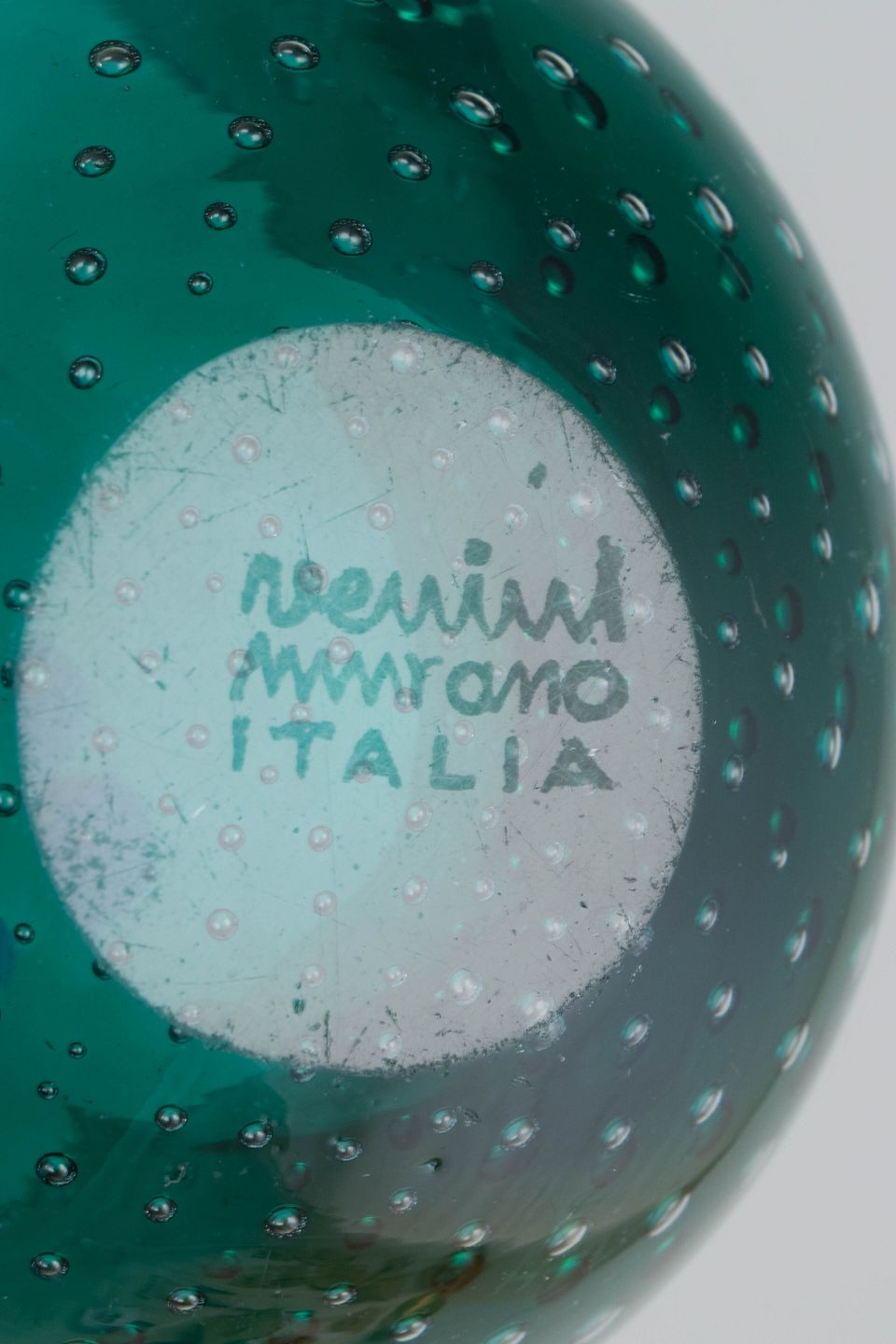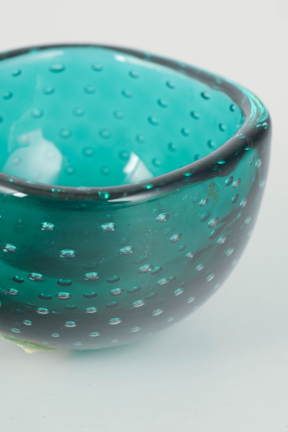 Rund skål i mundblæst glas med dyb turkisgrøn farve og jævnt fordelte luftbobler indkapslet i glasset, udført i klassisk muranesisk teknik. Den let afrundede form og den klare, transparente glasmasse giver et levende spil i overfladen og et elegant, tidstypisk udtryk. Fremstillet hos Venini i Murano i 1960’erne/70’erne.