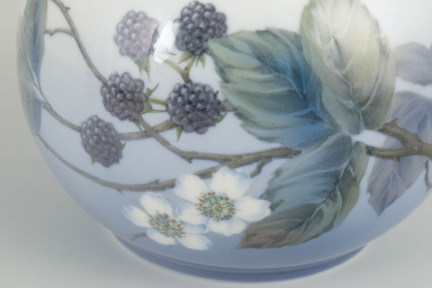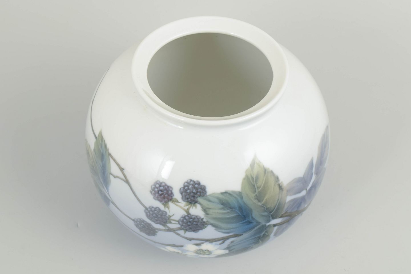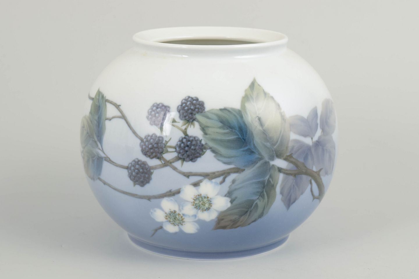 Rund, balusterformet vase i glaseret porcelæn med håndmalet underglasurdekoration af bærgrene og løv i afdæmpede blå, grønne og grå toner over en lys bund, afsluttet med en blød blåtonet overgang nederst. Udført efter Royal Copenhagens model fra 1962. Model 288/42B.