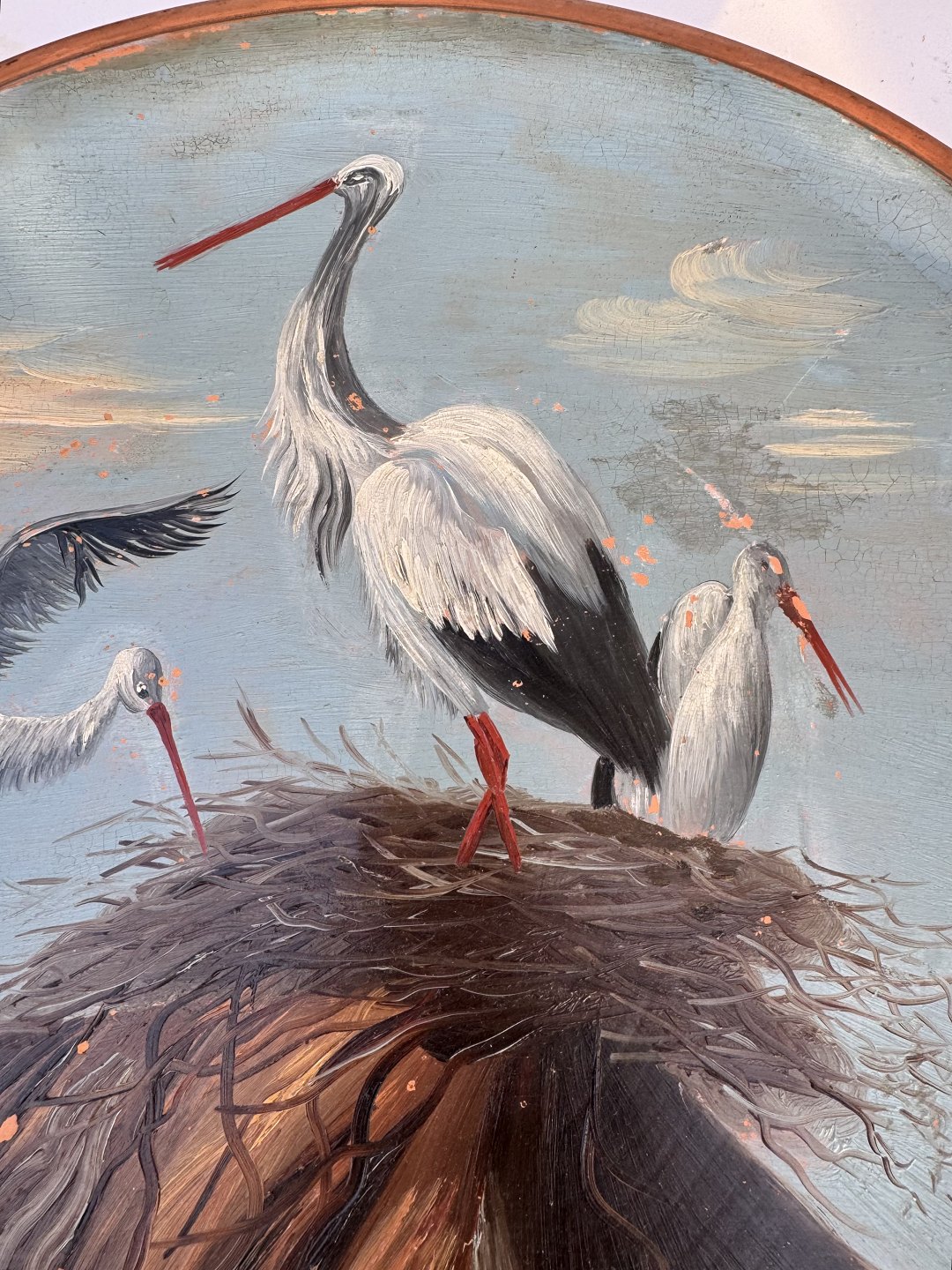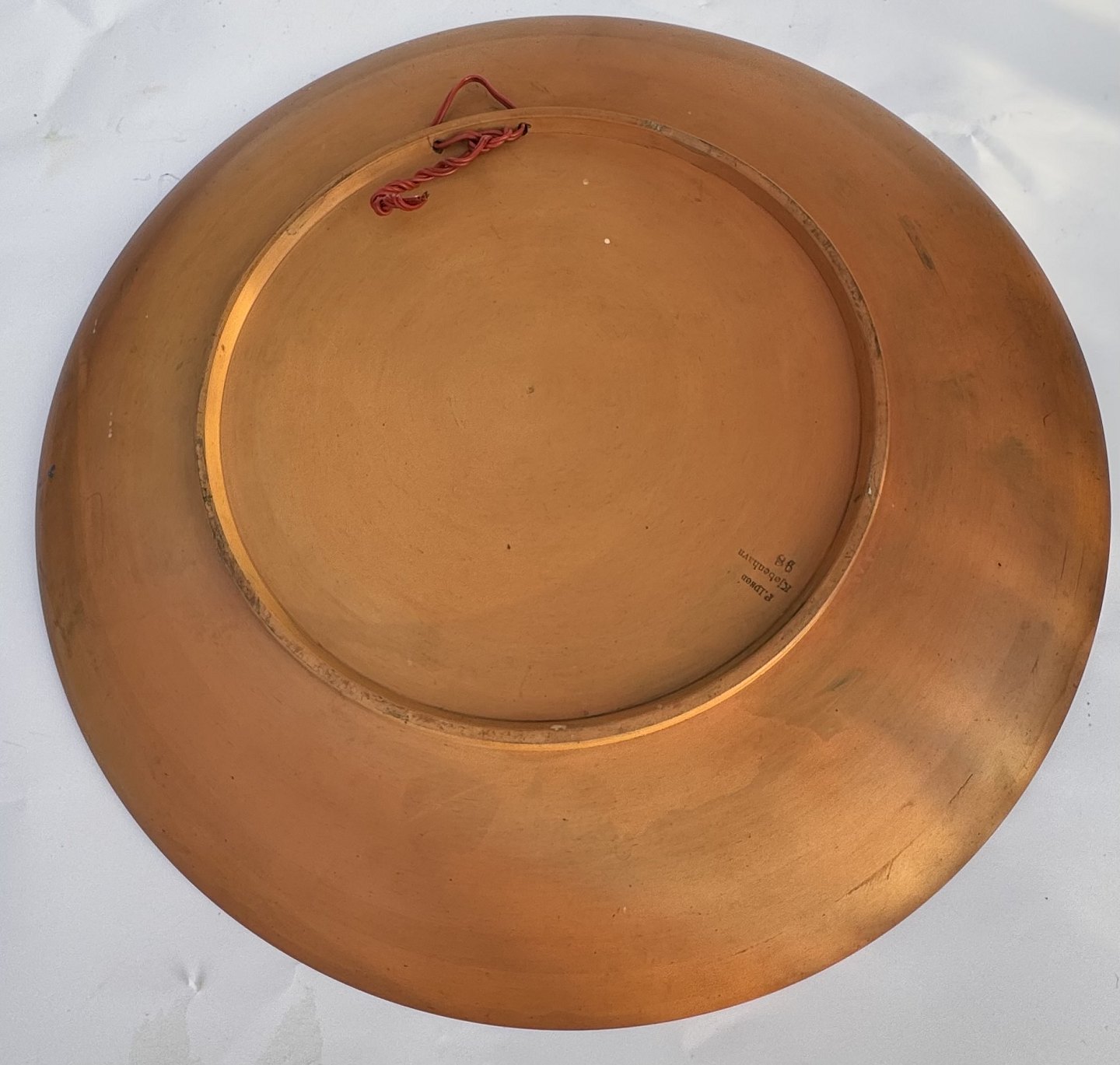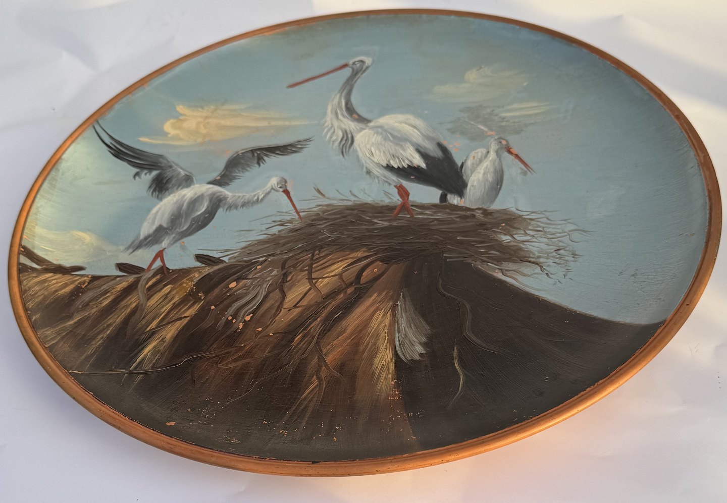 Meget stor platte terracotta fra Peter Ipsen, Kjøbenhavn fra omkring 1900. Bemalet med tre storke ved storkerede. Lidt overflade brugsspor. Ingen skader eller reparationer. Fabriksmærket på bagsiden. Mål: H. 4 cm Ø. 37 cm