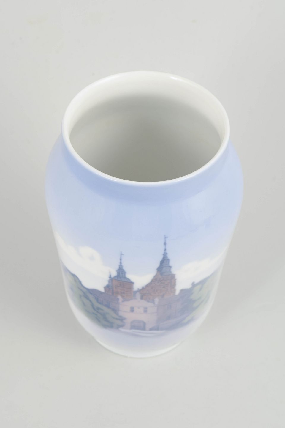 Vase i glaseret porcelæn med håndmalet underglasurdekoration forestillende Rosenborg Slot med tårne og omgivelser gengivet i bløde blå, grønne og brune nuancer over en lys bund. Model 4567.