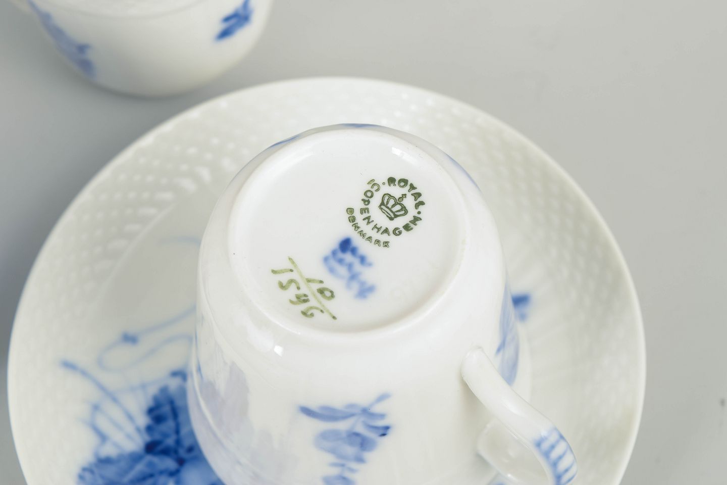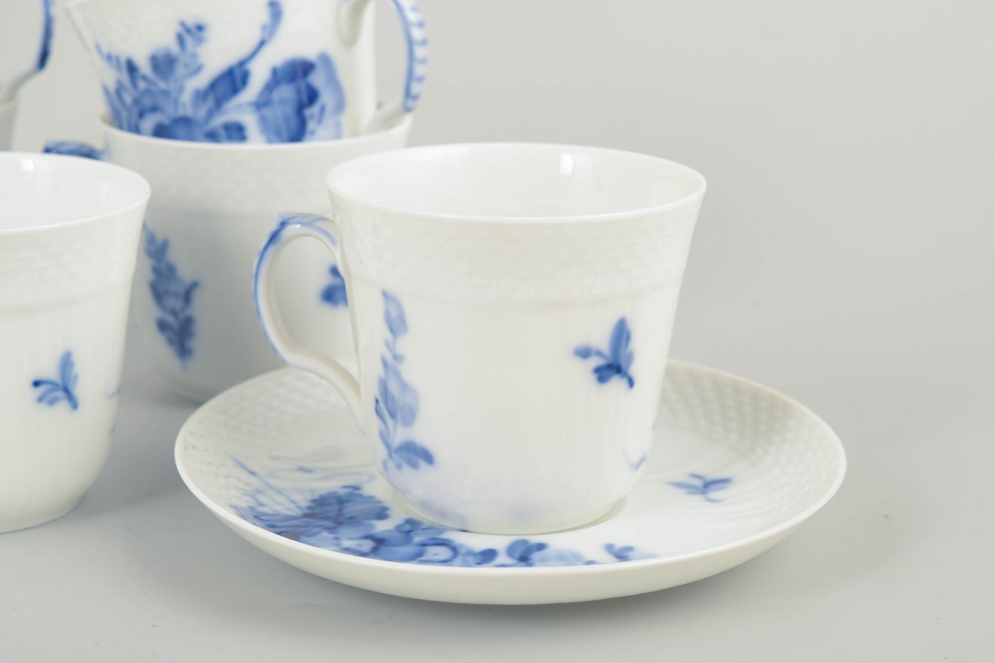 Sæt bestående af seks kaffekopper med tilhørende underkopper i glaseret porcelæn med håndmalet underglasurdekoration i det klassiske blå blomst flettede mønster. Model 10/1546.