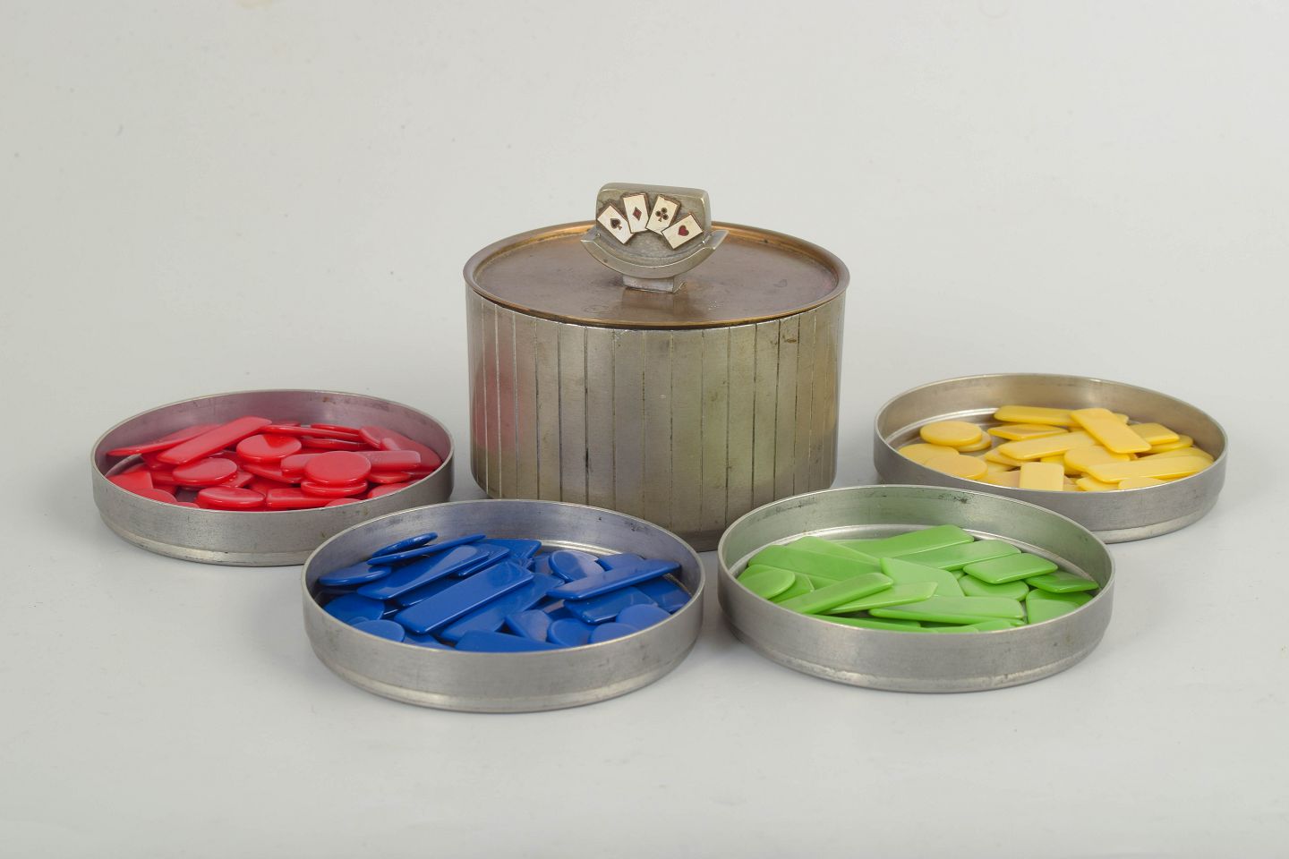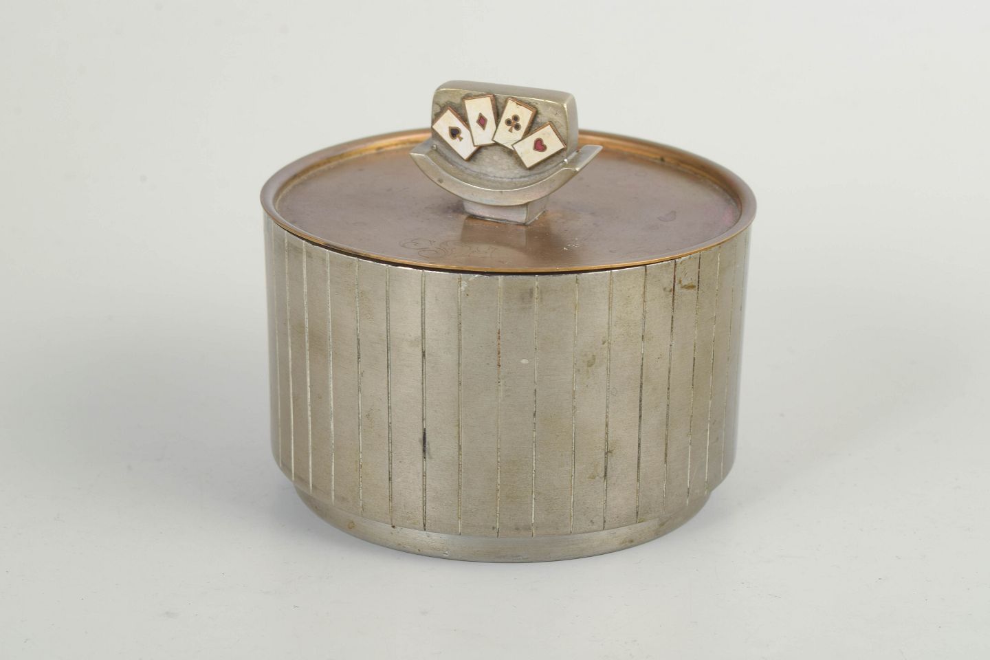 Art deco lågbeholder udført i tin med emaljerede spillekort i flere farver. Signeret GAB, Sverige, og fremstår som et komplet sæt.