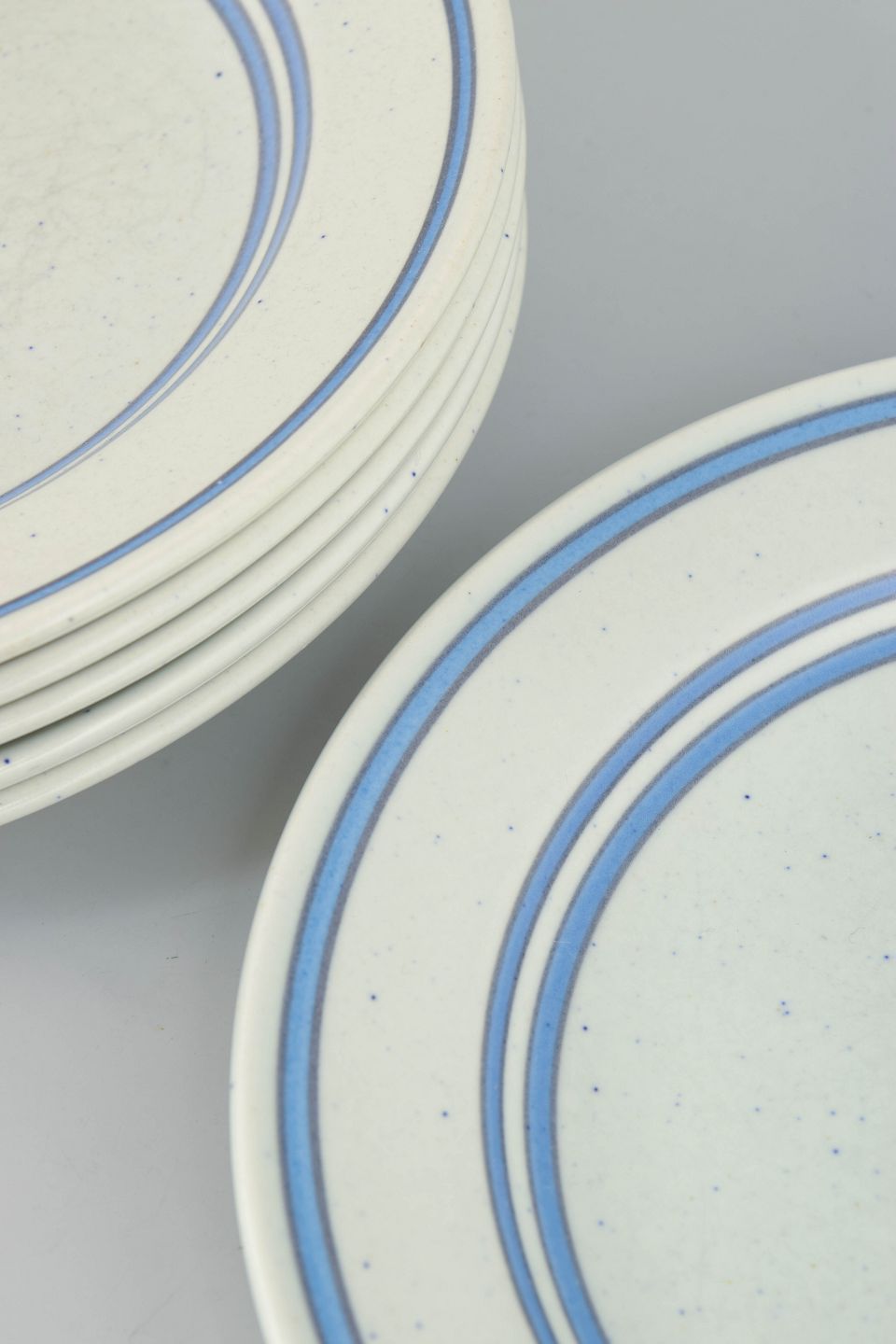 Sæt af salattallerkener i fajance med enkel, rund form og diskret dekoration i blå linjer på lys bund. Tallerkenerne er udført i Gustavsbergs “Dart”-serie, kendetegnet ved sit stringente og grafiske udtryk, som er typisk for Stig Lindbergs produktion i perioden.