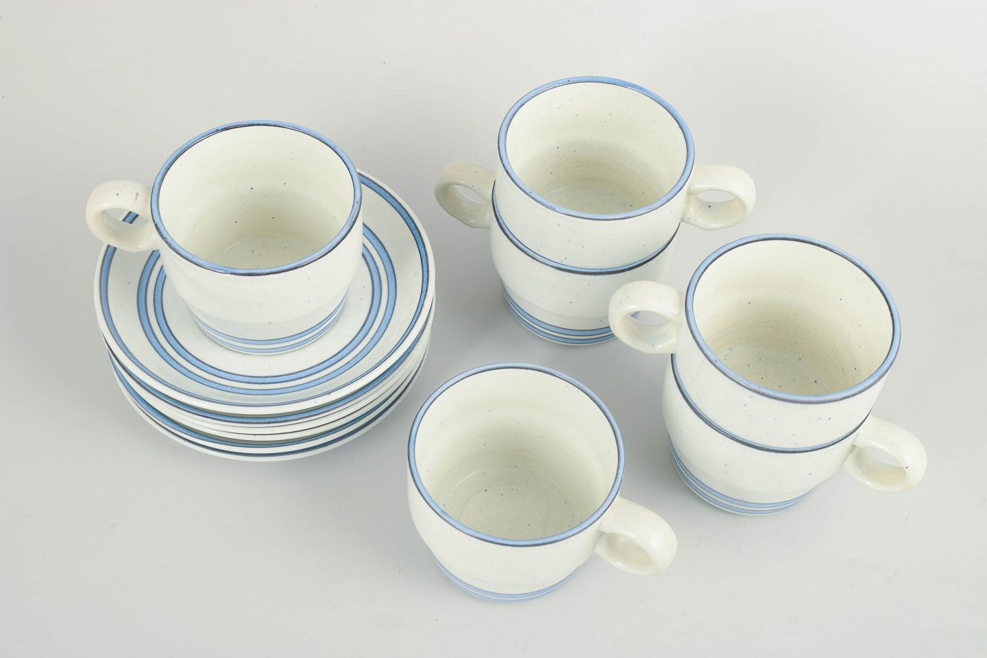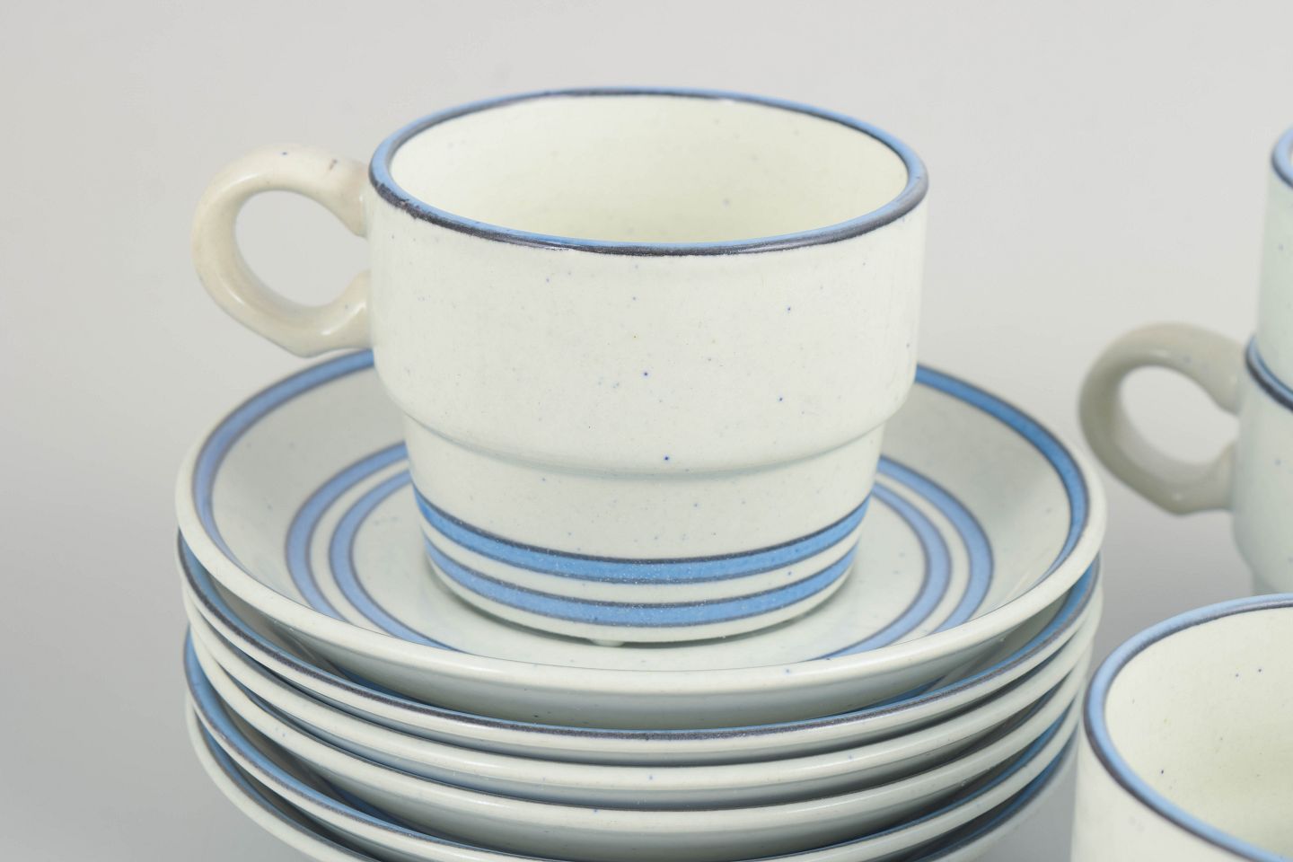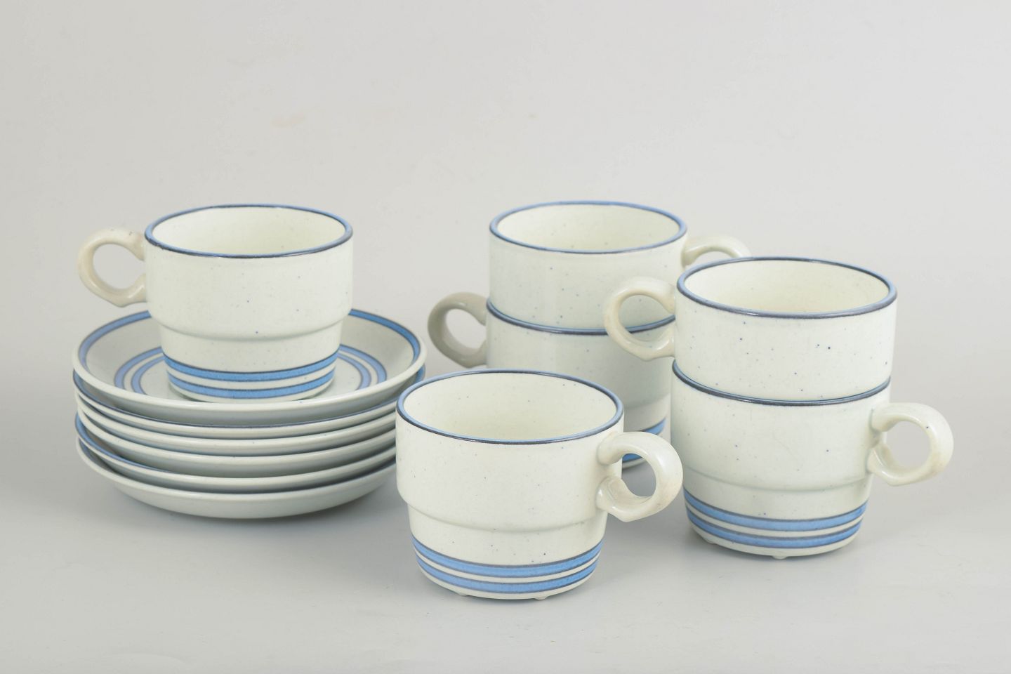 Sæt med seks kaffekopper med tilhørende underkopper i fajance. Serien er udført med enkle cylindriske former, let udadbøjede hanke og diskret dekoration i blå linjer på lys bund, karakteristisk for Stig Lindbergs funktionelle og grafiske formsprog. Udført efter Gustavsbergs model “Dart”.