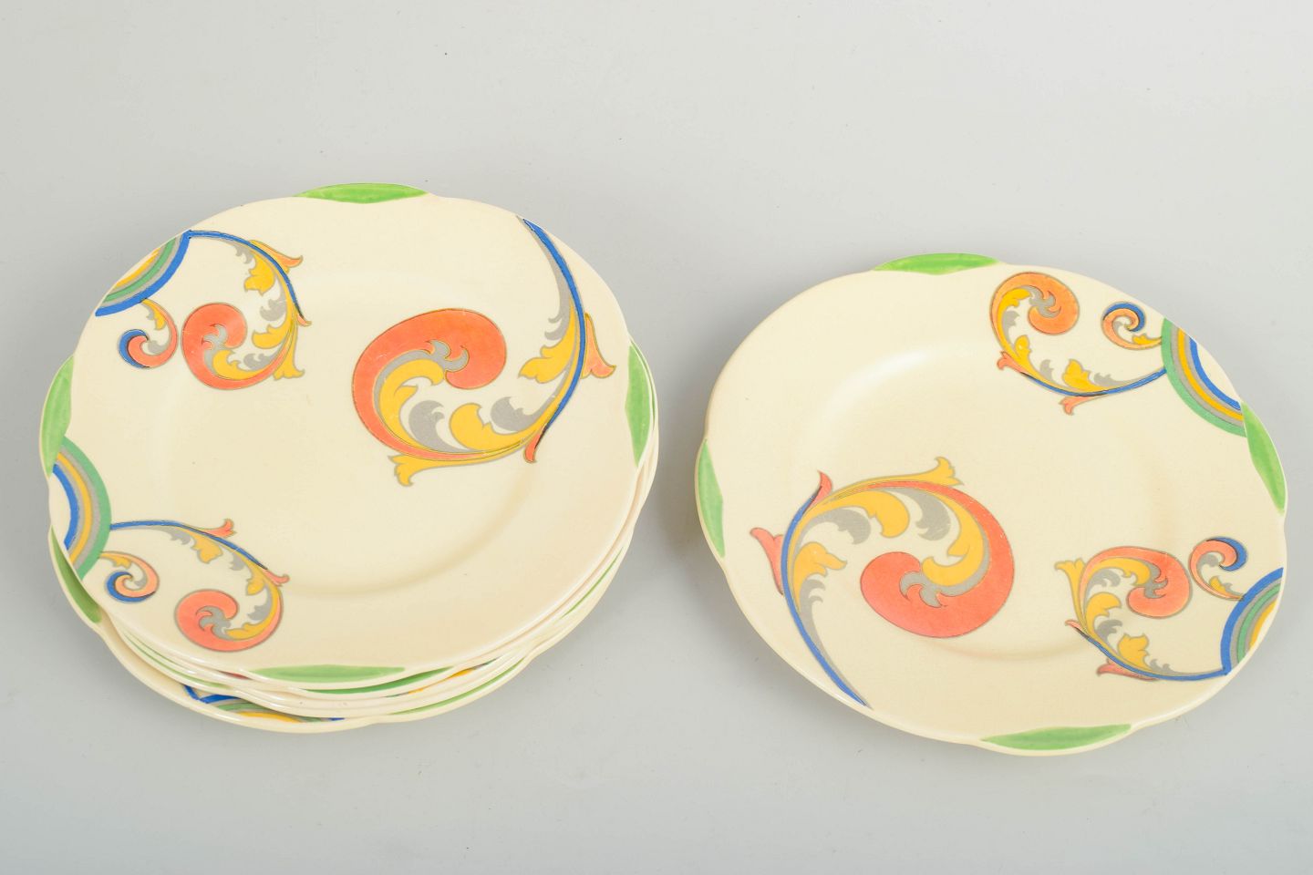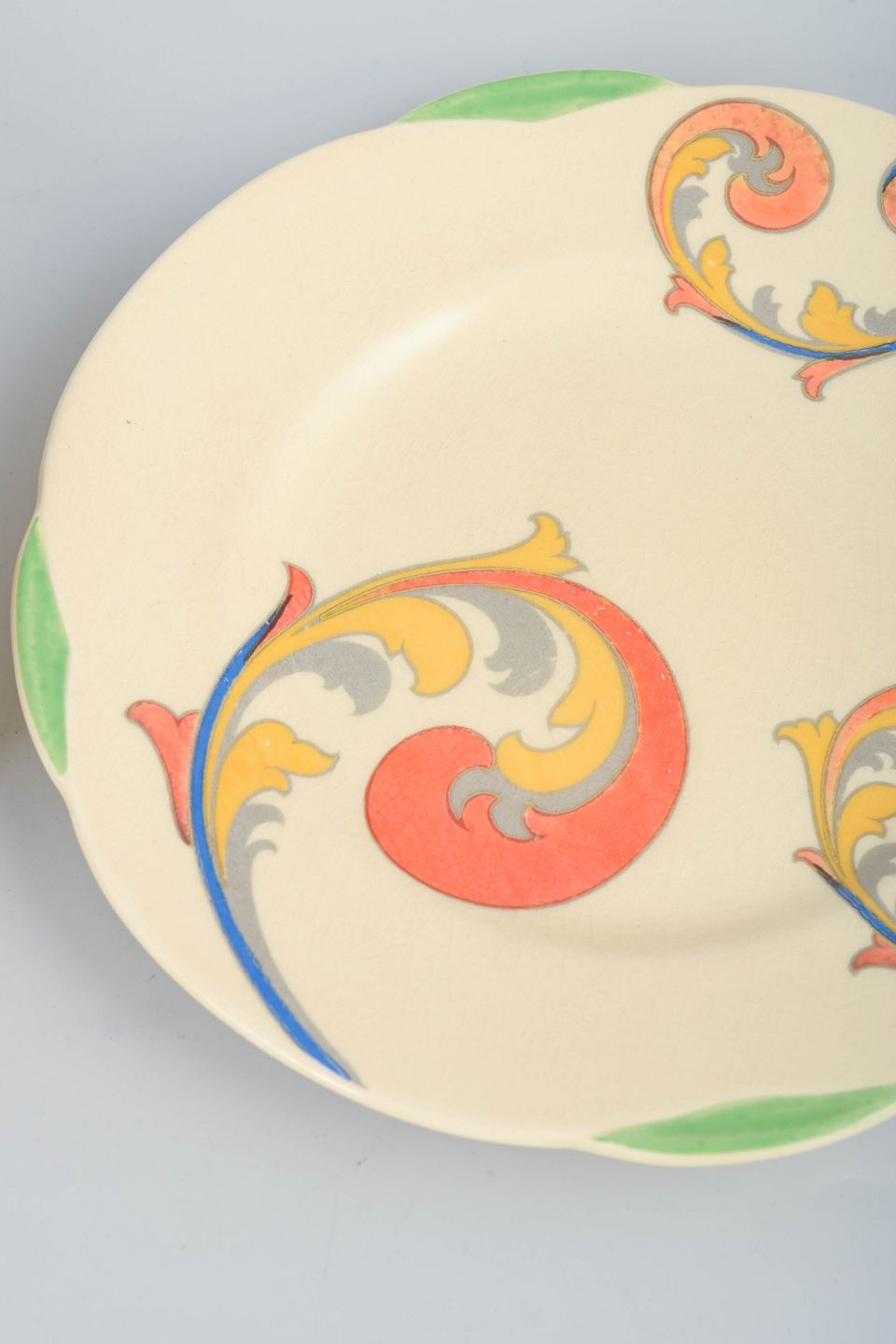 Art deco-kagetallerkener i fajance med farverig, håndmalet dekoration i “Syren”-serien. Tallerkenerne har rund form med let fane og et levende, stiliseret blomstermotiv i klare, tidstypiske farver, karakteristisk for Clarice Cliffs produktion i mellemkrigstiden.