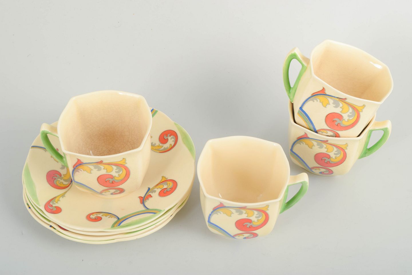 Text zugänglich auf Dänische: Clarice Cliff for Royal Doulton, sæt på 4 kaffekopper med underkopper.