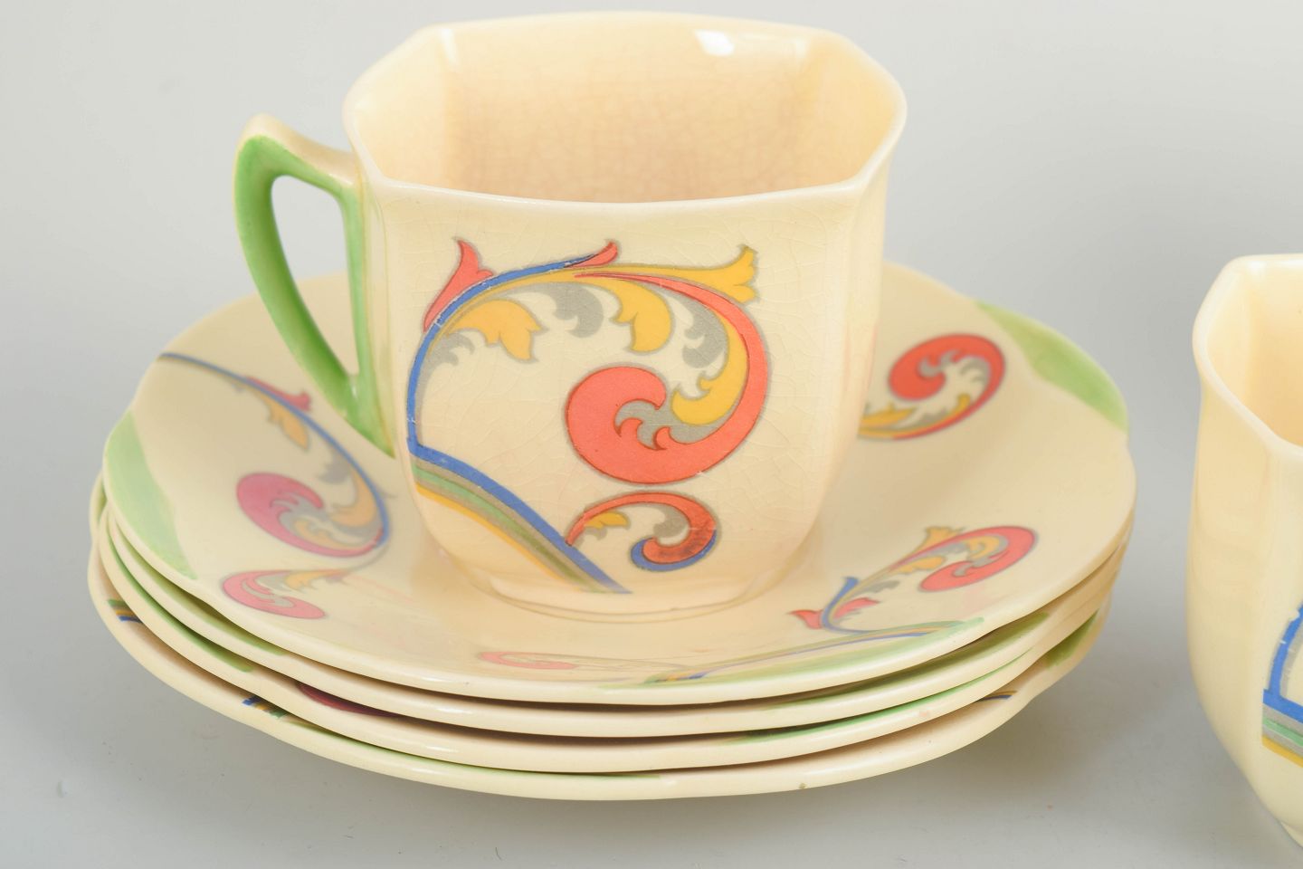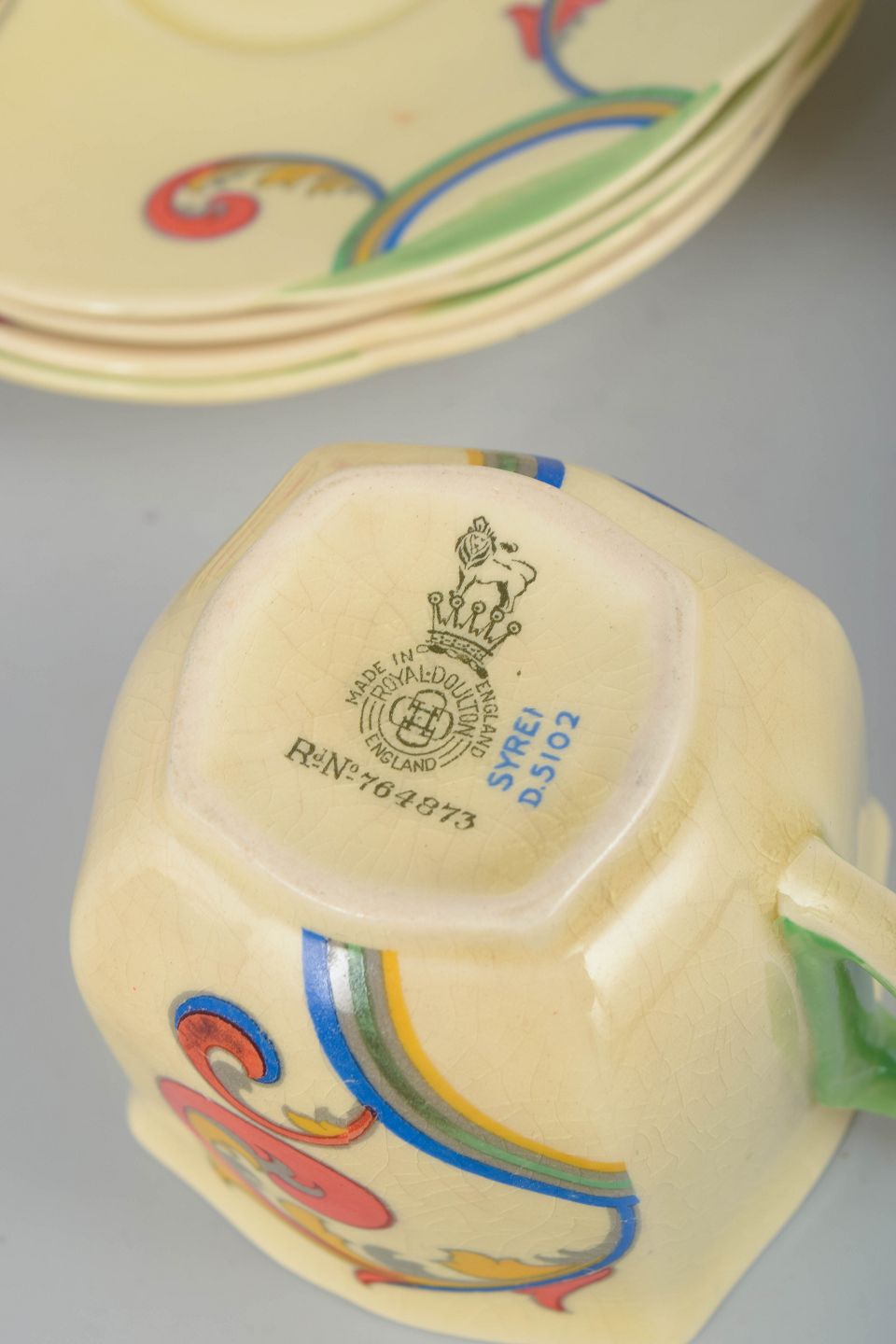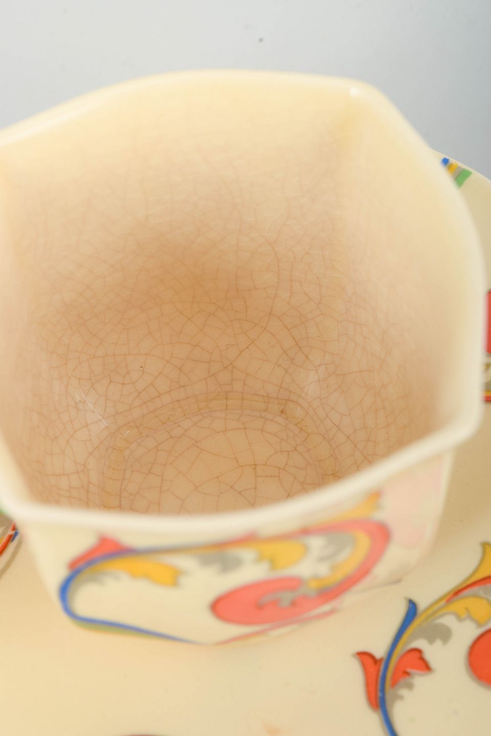 Clarice Cliff er blandt de mest markante navne inden for britisk art deco-keramik og er især kendt for sine dekorative, moderne former og iøjnefaldende mønstre produceret for Royal Doulton. Craqueléglasur ses ofte på fajance fra perioden og bidrager til et autentisk, tidstypisk udtryk, som i dag gør hendes stel særligt eftertragtede blandt samlere.