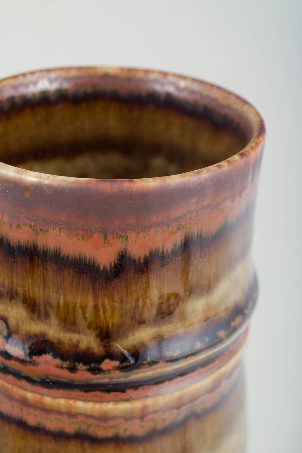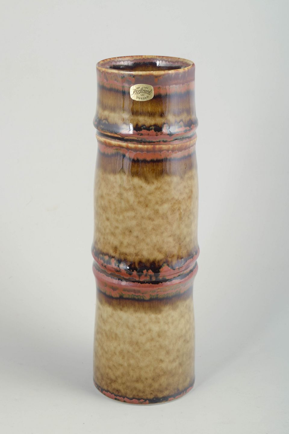 Slank, cylindrisk vase i stentøj med markant lodret formopbygning og let profilerede ringe. Overfladen er dækket af levende, løbende glasurer i varme brune, ravfarvede og beige nuancer med tydelig dybde og variation, karakteristisk for Rörstrands kunstneriske stentøjsproduktion i 1970’erne.